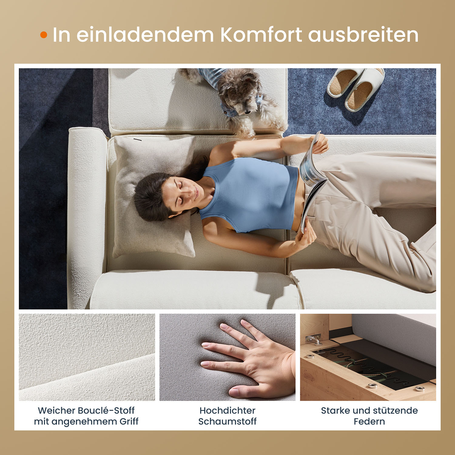 Ši sofa yra ne tik stilinga, bet ir funkcionali, pagaminta iš aukštos kokybės medžiagų, užtikrinančių ilgaamžiškumą ir patogumą. Eukalipto mediena ir plienas suteikia tvirtumo, o putplastis ir boulé audinys – komfortą ir minkštumą. Tai puikus pasirinkimas jūsų svetainei, kuriame susijungia estetika ir praktiškumas.