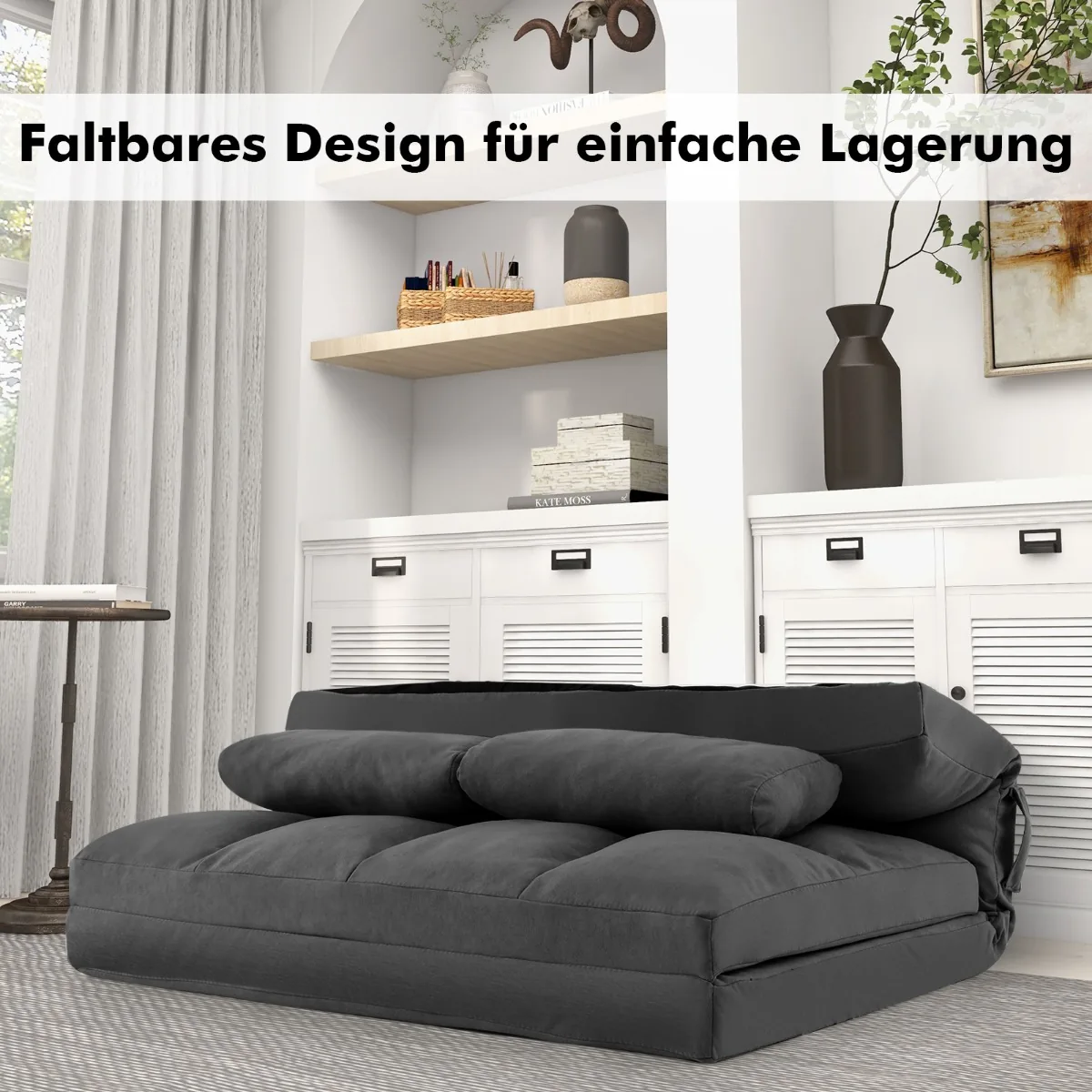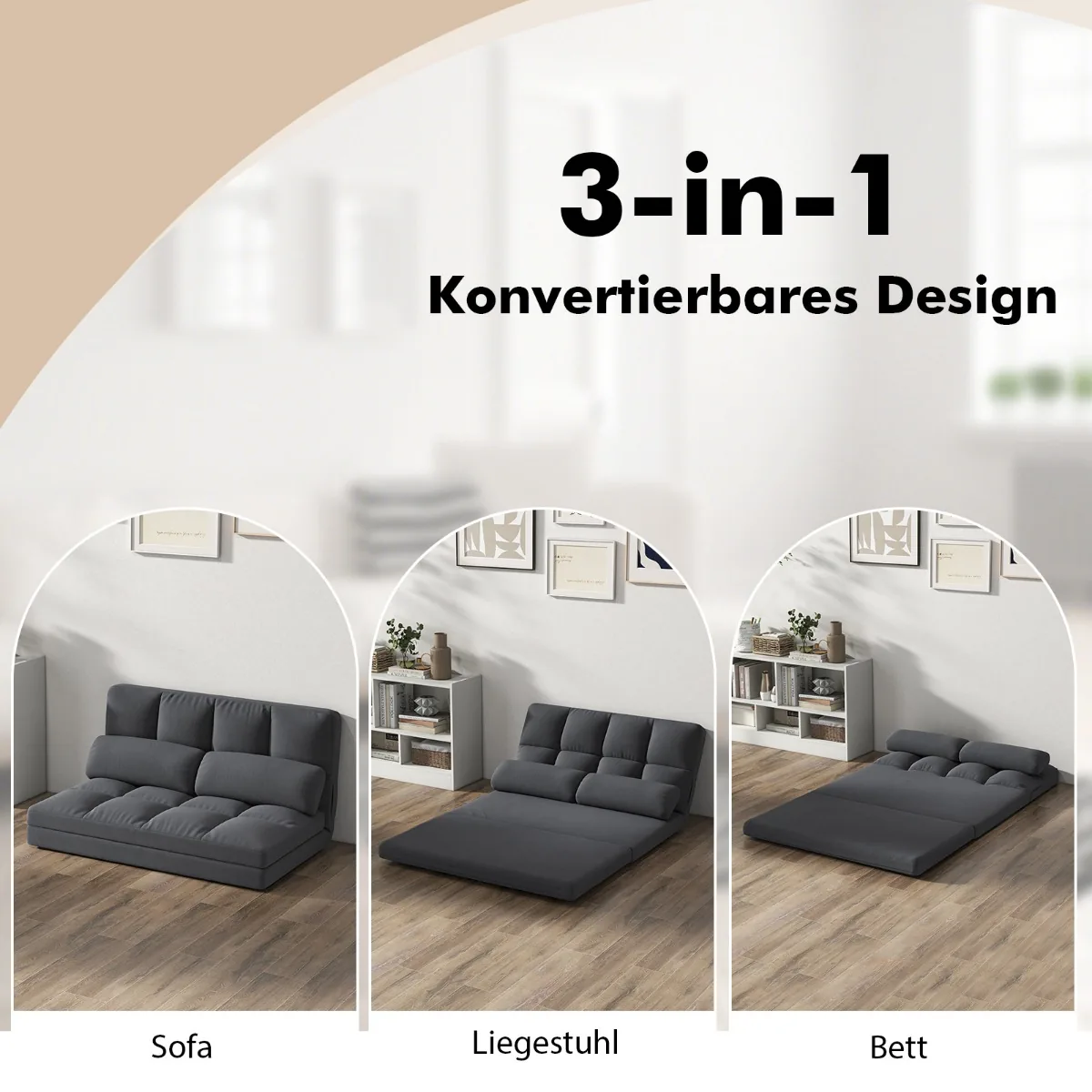- Trijų funkcijų grindų sofa: sofa, gultas ir lova viename.
