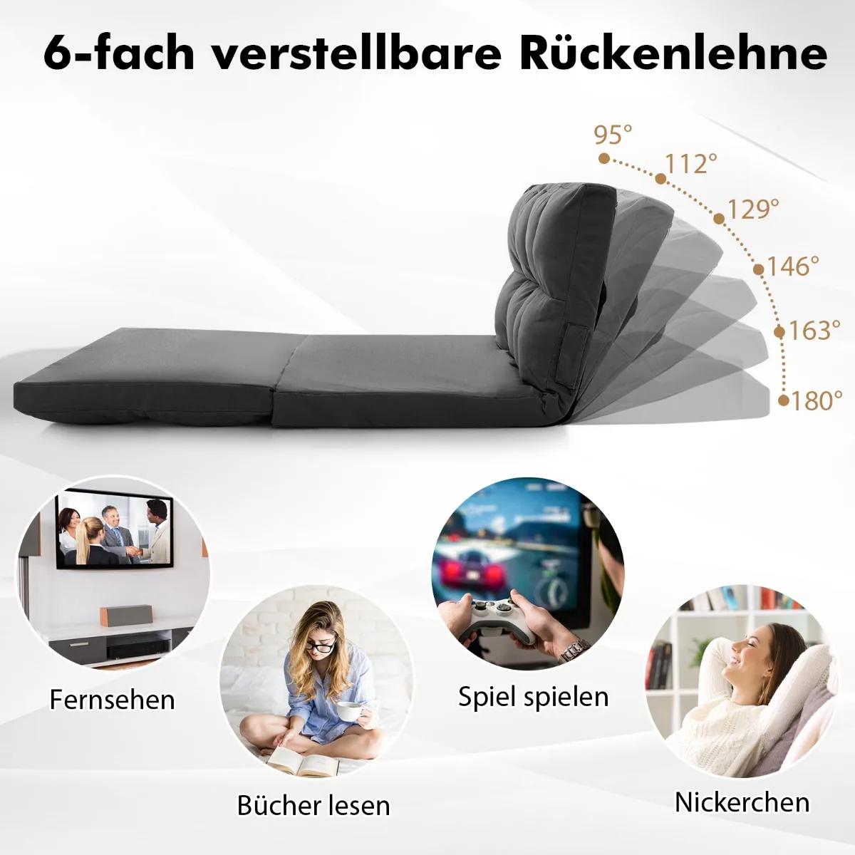 - Atlošas reguliuojamas 6 pozicijose: 95°, 112°, 129°, 146°, 163° ir 180°.