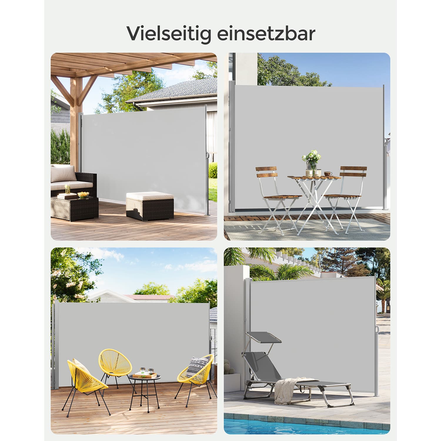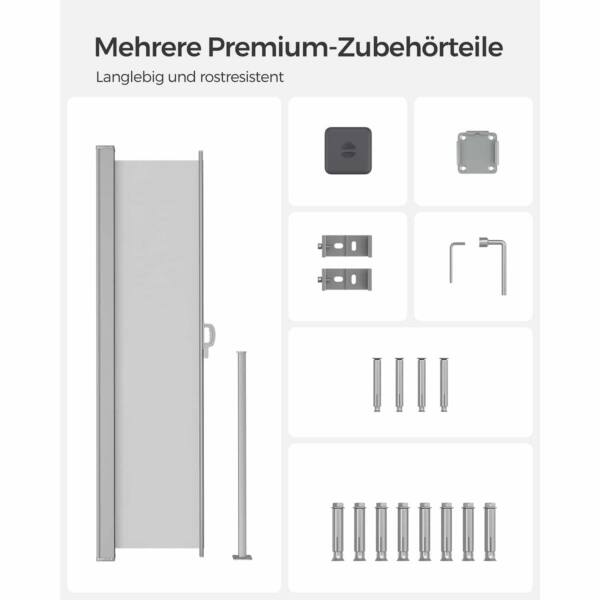 Šoninė markizė 160×350 cm, šviesiai pilkos spalvos, yra puikus sprendimas jūsų lauko erdvės apsaugai nuo saulės ir vėjo. Jos elegantiška šviesiai pilka spalva suteikia modernumo ir stiliaus jūsų terasai ar balkonui.
