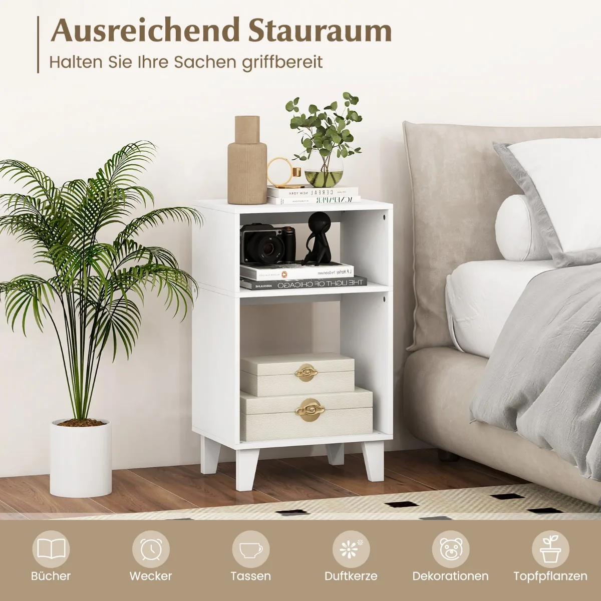 - Daug vietos saugojimui – stalviršis ir du atviri skyriai leidžia laikyti knygas, dekoracijas, žadintuvus ar kitus būtinus daiktus.