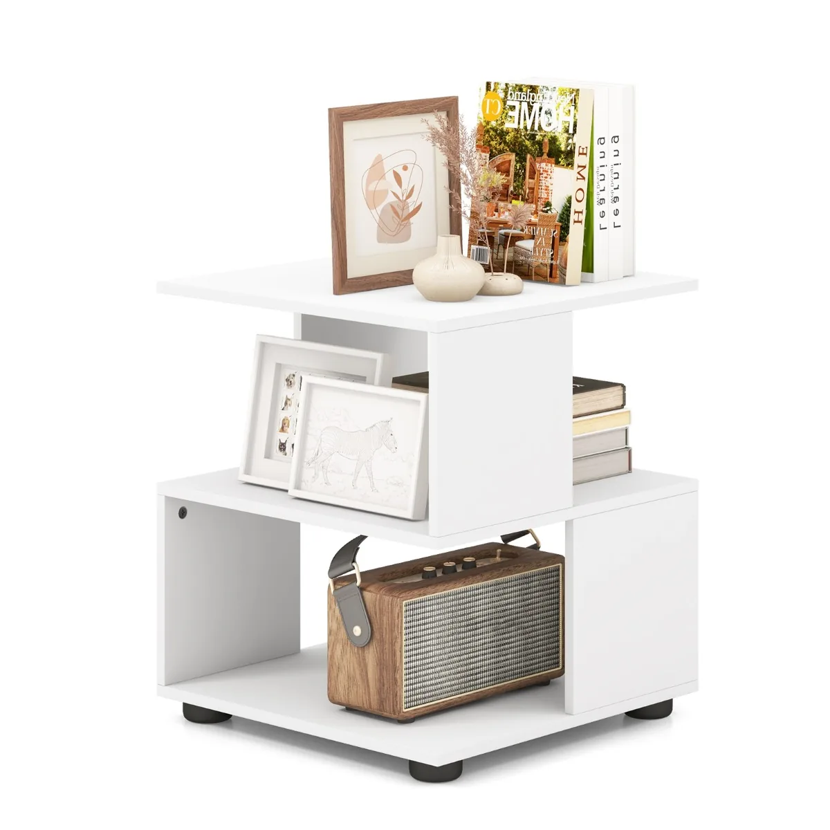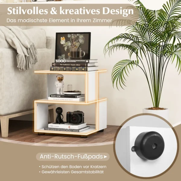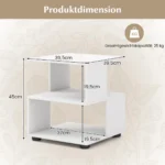 Šoninis staliukas 39,5×39,5×45 cm, baltos spalvos, yra praktiškas ir funkcionalus baldas jūsų svetainei, miegamajam ar darbo kambariui. Trys lentynų pakopos suteikia pakankamai vietos įvairiems daiktams laikyti, o vandeniui atsparus paviršius leidžia lengvai prižiūrėti staliuko švarą.