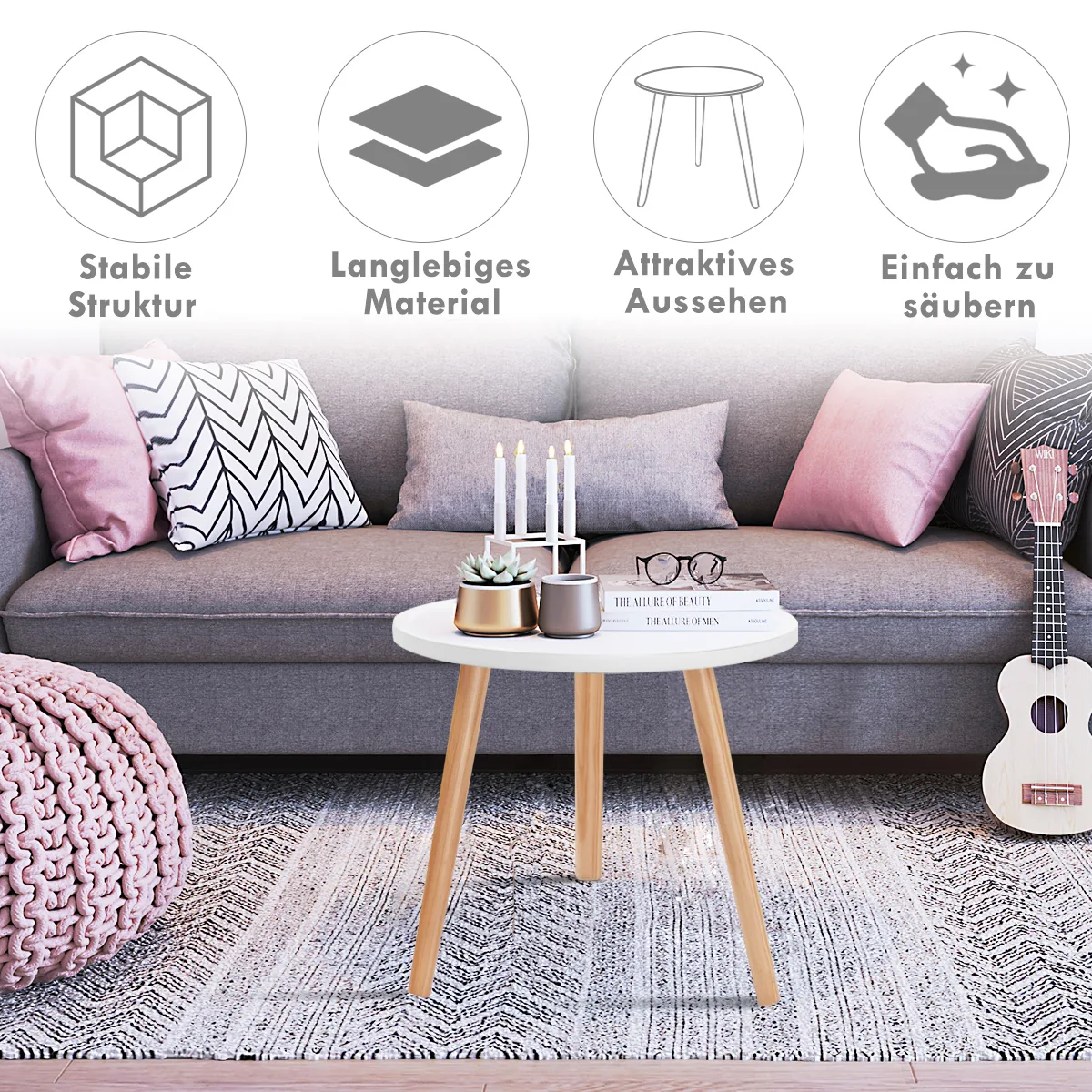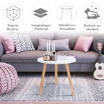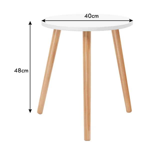 Šoninis staliukas 40x40x48 cm, šviesiai rudos ir baltos spalvos, puikiai tinka įvairioms patalpoms. Dėl kompaktiško dydžio ir apvalaus stalviršio jis tinka kaip papildomas baldas prie sofos, kėdės ar miegamojo. Staliuko konstrukcija iš MDF ir pušies užtikrina patvarumą ir ilgaamžiškumą.