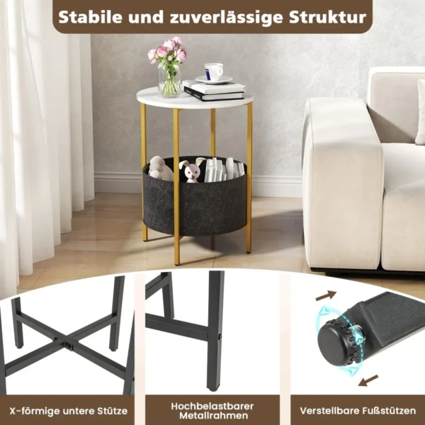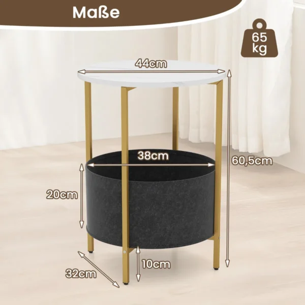 Šoninis staliukas 44×60,5cm yra funkcionalus ir kompaktiškas baldas, tinkantis įvairioms erdvėms, tokioms kaip svetainė, miegamasis ar namų biuras. Dėl apvalaus stalviršio, metalinės konstrukcijos ir nuimamo veltinio krepšelio šis staliukas puikiai atlieka tiek šoninio, tiek naktinio staliuko funkcijas.