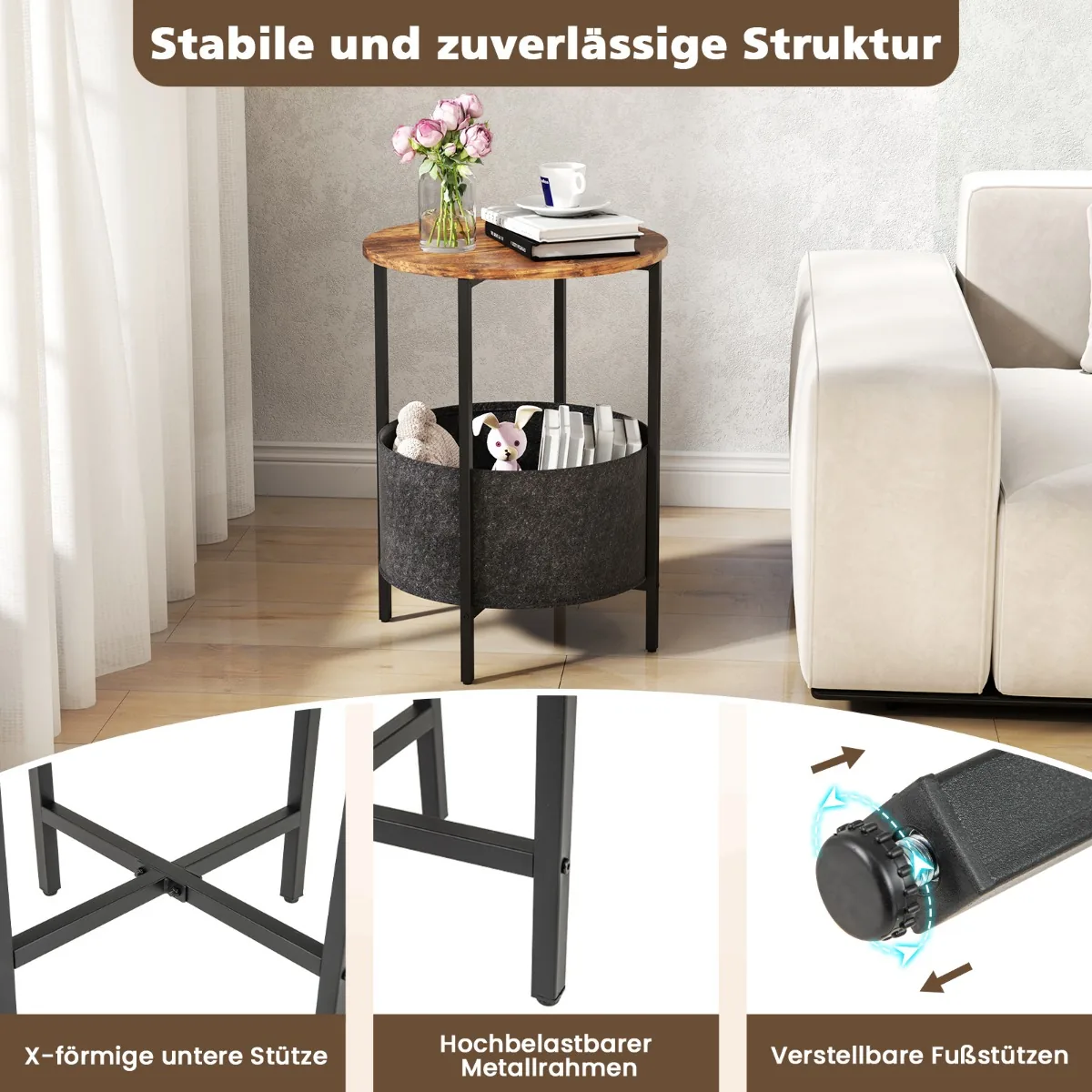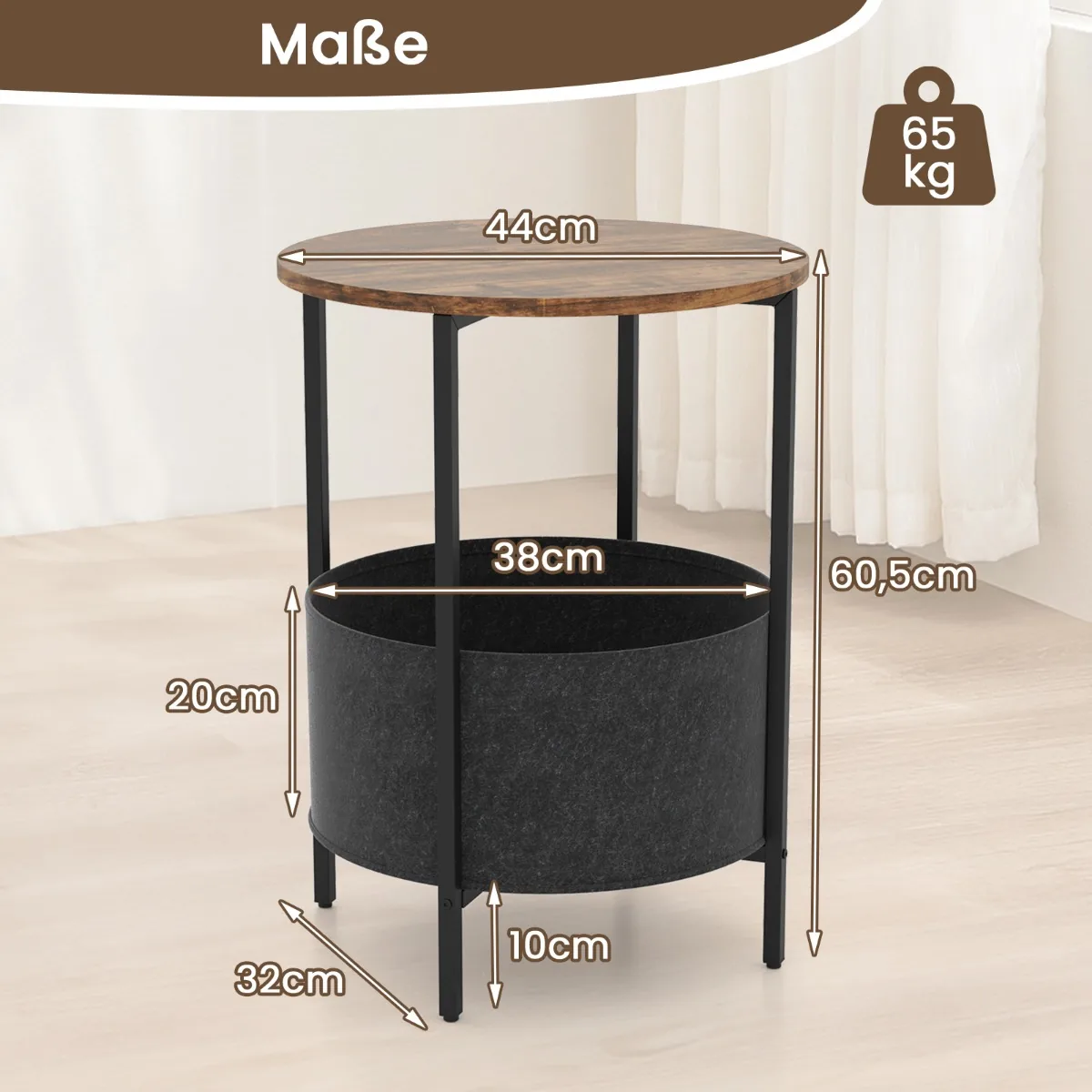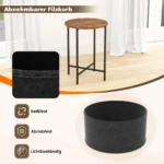 Šoninis staliukas 44×60,5 cm, juodos ir rudos spalvos, yra praktiškas sprendimas įvairioms namų erdvėms. Apvalus stalviršis kartu su nuimamu veltinio krepšiu suteikia papildomos vietos daiktų saugojimui. Tvirtas metalinis rėmas ir reguliuojamos pėdų pagalvėlės užtikrina stabilumą net ant nelygaus paviršiaus.