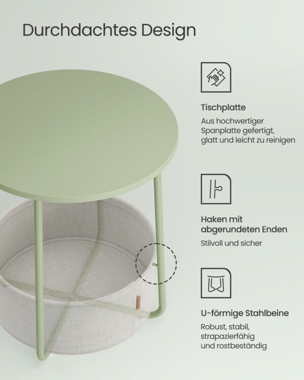 Šis šoninis staliukas ne tik puikiai atrodo, bet ir yra itin praktiškas. Jo tvirtas plieninis rėmas užtikrina stabilumą, o medžiaginis krepšelis suteikia papildomą vietą smulkiems daiktams laikyti. Tai idealus pasirinkimas tiems, kurie vertina kokybę ir stilių.