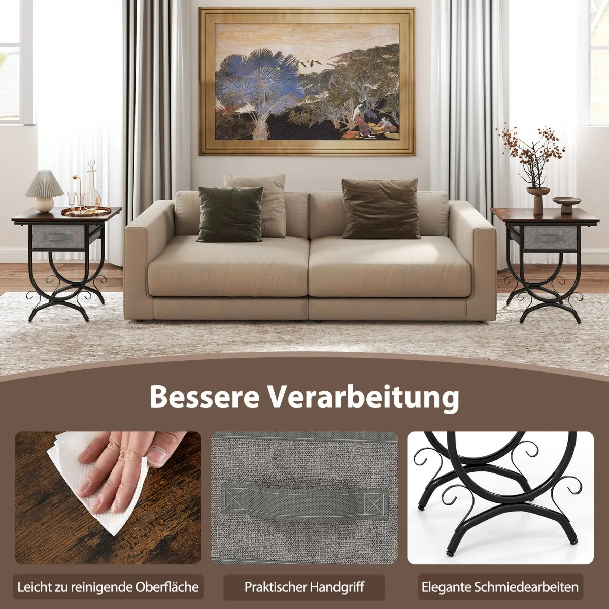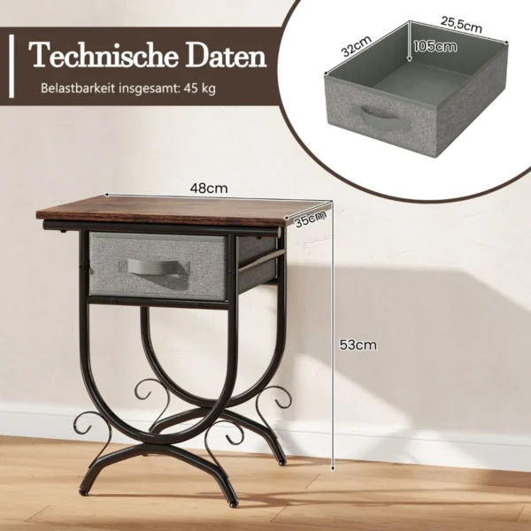 Šoninis staliukas 48x35x53 cm rudos ir juodos spalvos puikiai tinka įvairiems interjero sprendimams. Jo pramoninio stiliaus dizainas ir metalinis rėmas užtikrina patvarumą ir funkcionalumą. Kompaktiškas šoninis stalas lengvai pritampa prie svetainės, miegamojo ar darbo kambario.