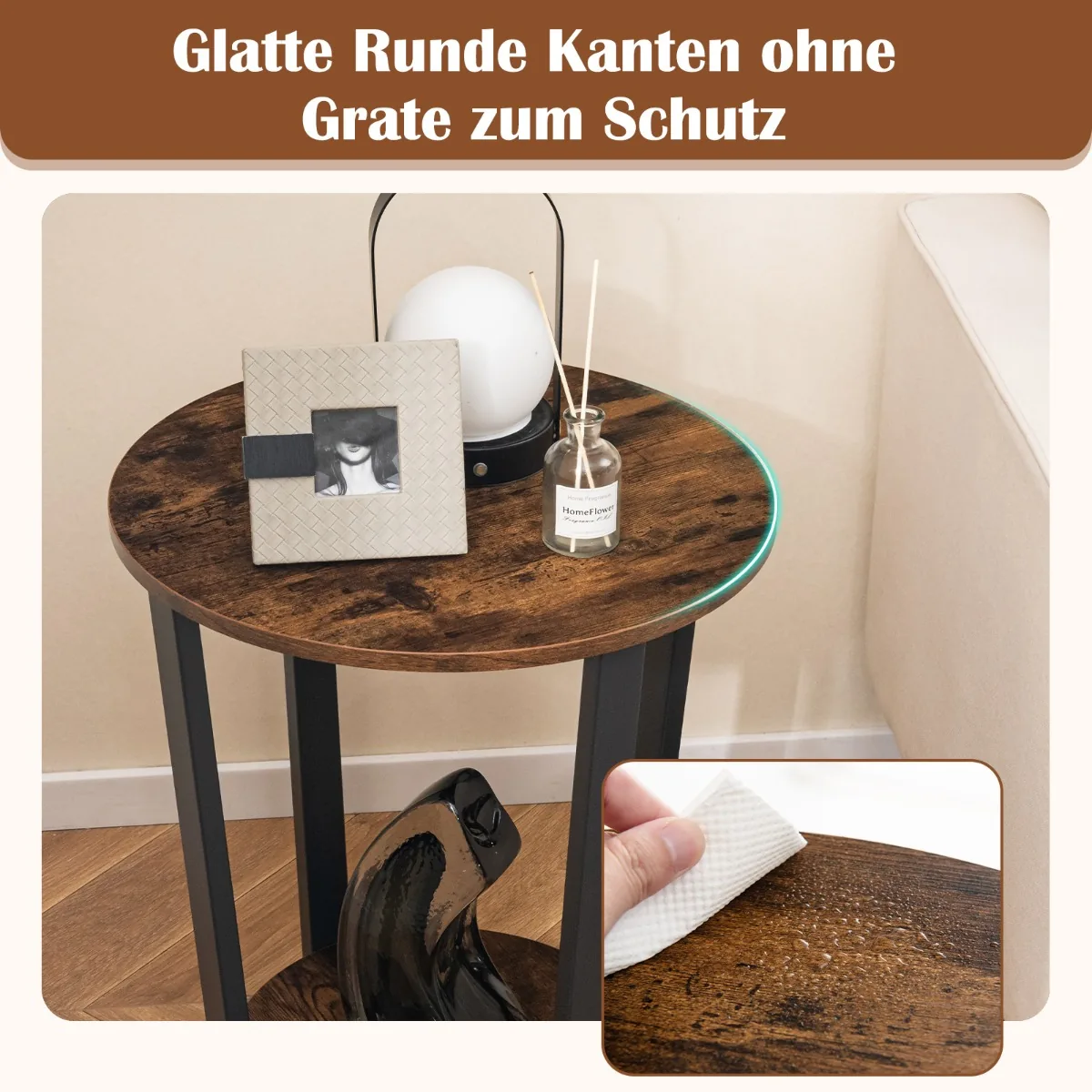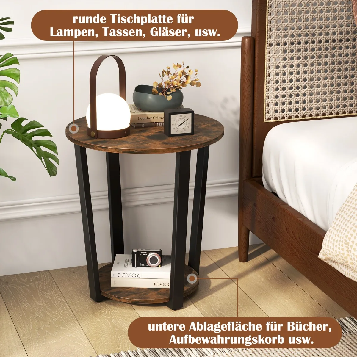 - Dviejų lygių apvalus šoninis staliukas su atvira lentyna patogiam daiktų laikymui.