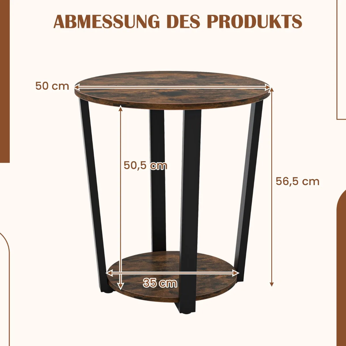Šoninis staliukas 50x50x56,5 cm rudos ir juodos spalvos – funkcionalus sprendimas jūsų svetainei ar miegamajam. Dviejų pakopų apvalus staliukas su metaliniu rėmu suteikia patogią saugojimo ir ekspozicijos vietą, derindamas industrinį dizainą su kaimišku medienos raštu.