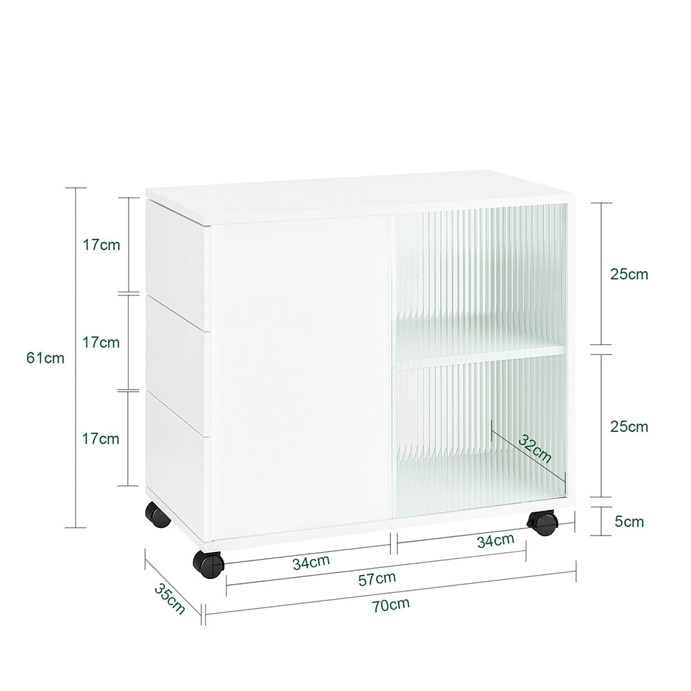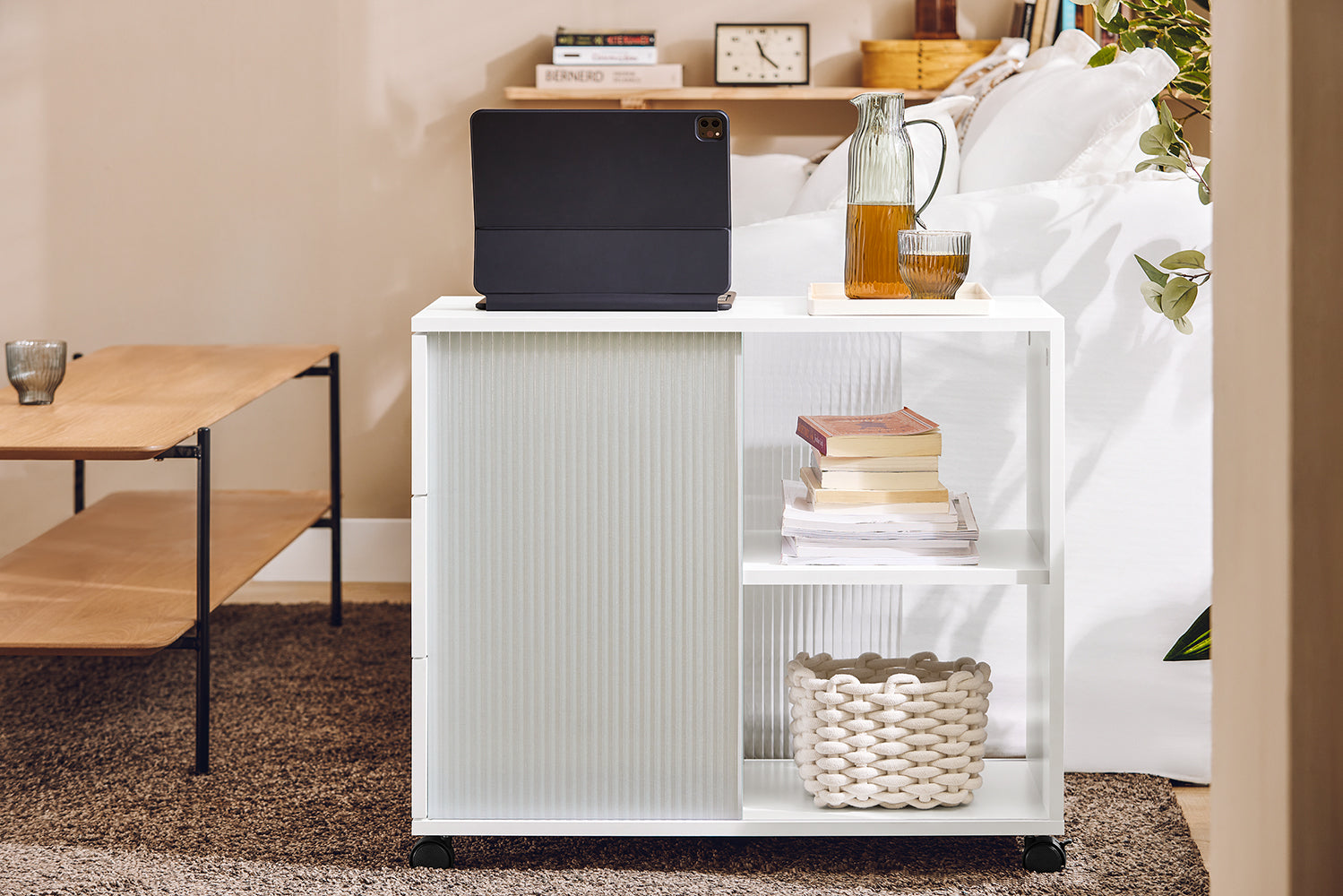 Šoninis staliukas turi atvirą lentyną, kuri suteikia daug vietos daiktams laikyti. Keturi universalūs ratukai leidžia staliukui lengvai judėti bet kuria kryptimi, nebraižant grindų. Taip pat yra 2 užrakinami ratukai, kurie užtikrina stabilumą tam tikroje vietoje. Ratukai juda tyliai, todėl naudojimas yra patogus ir malonus.