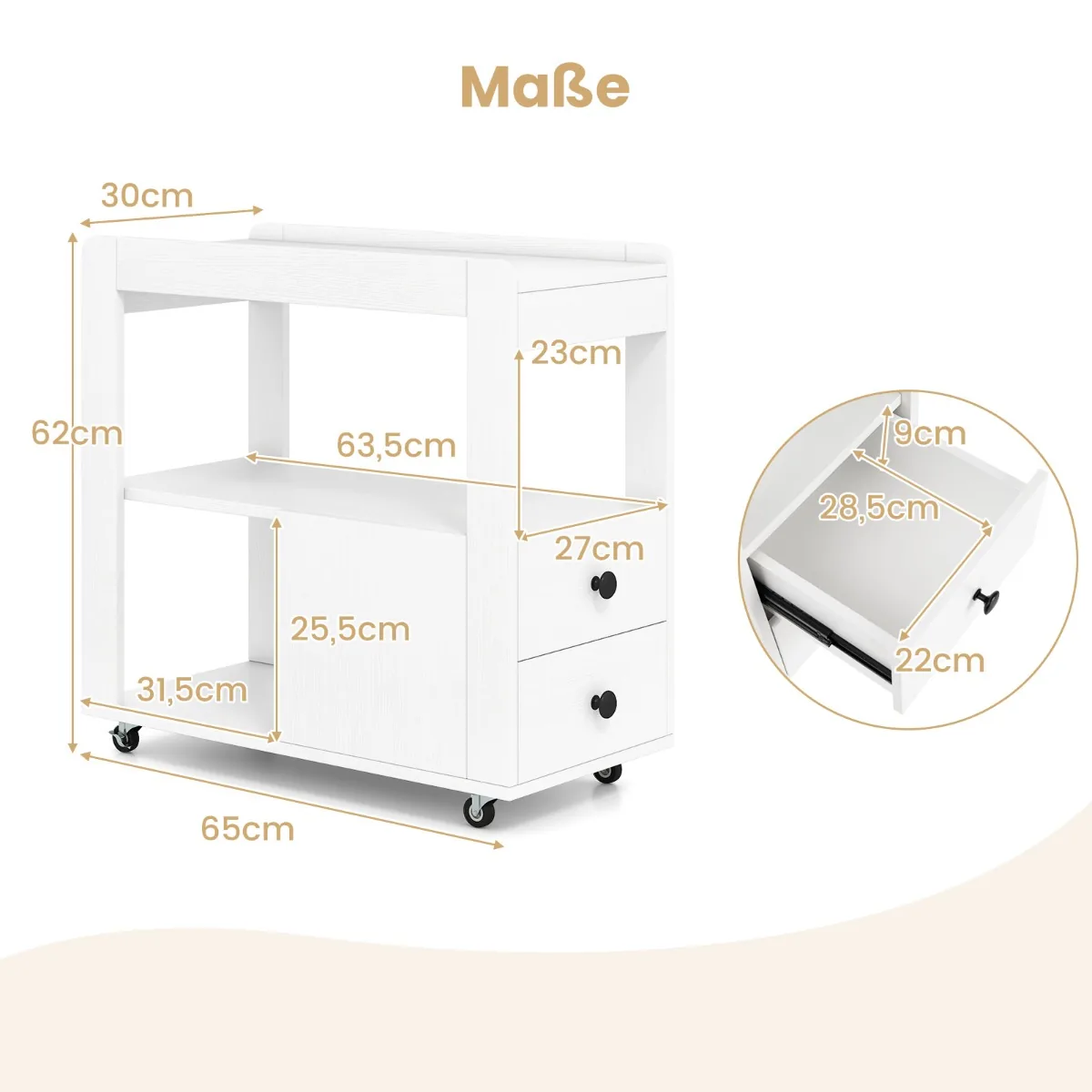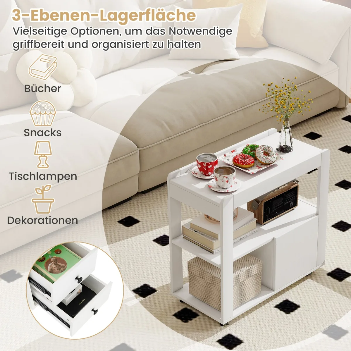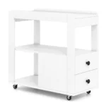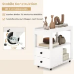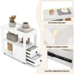 Šoninis staliukas 65x30x62cm, baltos spalvos, puikiai tinka papildomai saugojimo erdvei jūsų namuose ar biure. Mobilus ir kompaktiškas dizainas leidžia lengvai judinti stalą pagal poreikį, o užrakinamos ratukų funkcijos užtikrina stabilumą naudojimo metu.
