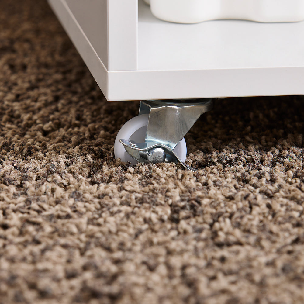Šoninis staliukas turi atvirą lentyną, kuri suteikia daug vietos daiktams laikyti. Keturi universalūs ratukai leidžia staliukui lengvai judėti bet kuria kryptimi, nebraižant grindų. Taip pat yra 2 užrakinami ratukai, kurie užtikrina stabilumą tam tikroje vietoje. Ratukai juda tyliai, todėl naudojimas yra patogus ir malonus.