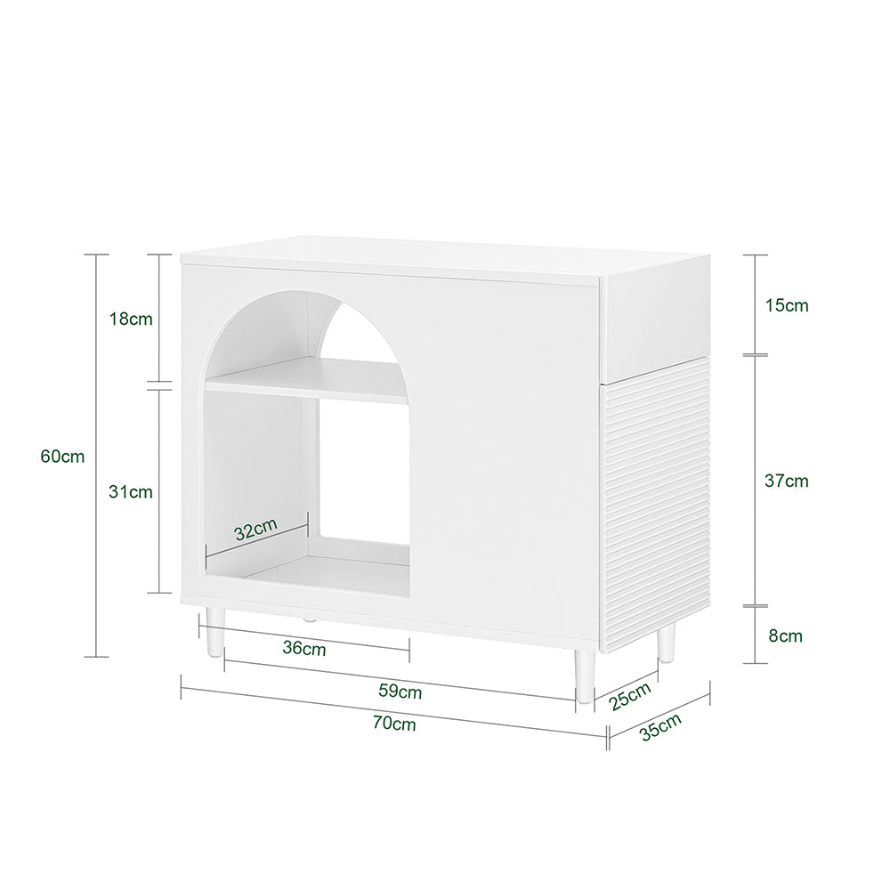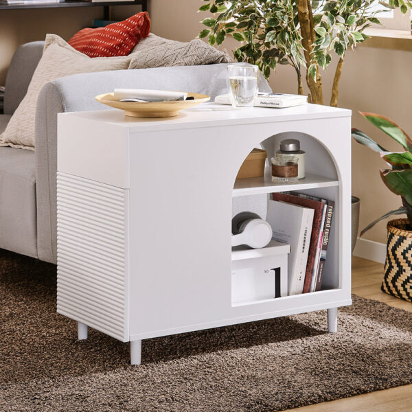 Šis modernus ir praktiškas šoninis staliukas 70x35x60 cm, baltos spalvos, yra puikus pasirinkimas jūsų interjerui. Jo kompaktiškas dizainas leidžia sutaupyti vietos, tačiau išlaiko funkcionalumą.
