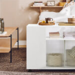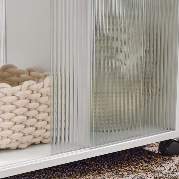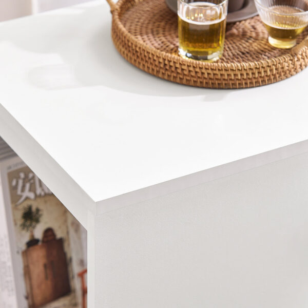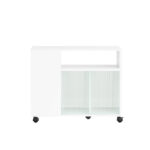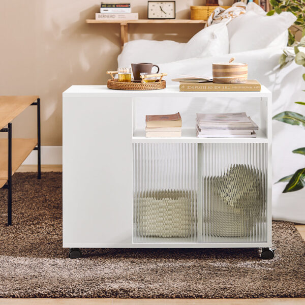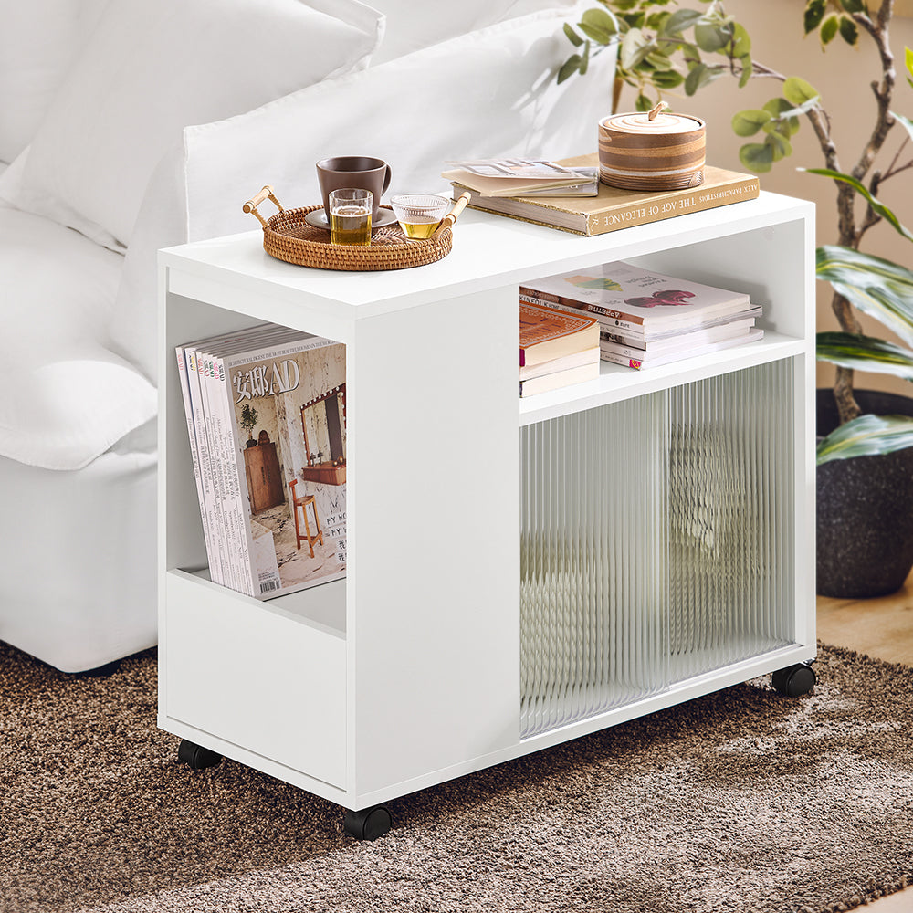 Šoninis staliukas turi atvirą lentyną, kuri suteikia daug vietos daiktams laikyti. Keturi universalūs ratukai leidžia staliukui lengvai judėti bet kuria kryptimi, nebraižant grindų. Taip pat yra 2 užrakinami ratukai, kurie užtikrina stabilumą tam tikroje vietoje. Ratukai juda tyliai, todėl naudojimas yra patogus ir malonus.