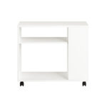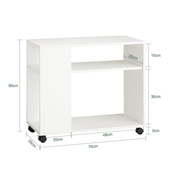 Šis šoninis staliukas ant ratukų 70x35x60 cm, baltos/juodos spalvos, yra puikus pasirinkimas tiems, kurie ieško papildomos vietos daiktams laikyti ar darbui. Jo skandinaviškas dizainas su švariais ir paprastais linijomis puikiai dera su įvairių stilių baldais.