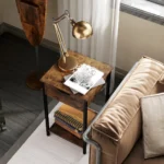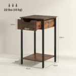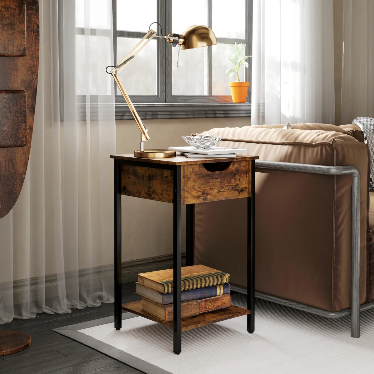 Patirkite pramoninį HOMCOM šoninio stalo žavesį – puikų kaimiškų rudų plokščių ir elegantiškų juodų vamzdžių derinį. Kavos staliukas, skirtas naudoti kaip šoninis staliukas, naktinis staliukas ar augalų stovas, turi naudingą stalčių ir daiktadėžę. Puikiai išdėstyti šalia sofos, fotelio ar lovos, reguliuojamos pėdų pagalvėlės užtikrina stabilumą ant visų paviršių.