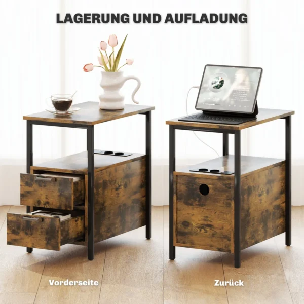 Atraskite stilingą HOMCOM šoninį stalą! Šiame kompaktiškame stalelyje yra du 3 kontaktų lizdai, USB prievadas ir C tipo lizdas, todėl jūsų įrenginiai visada bus paruošti naudoti. Du stalčiai ir atviras skyrius yra idealus naktinis staliukas arba sofos staliukas. Modernaus dizaino dažytas metalinis telefono staliuko rėmas kiekvienam kambariui suteikia ypatingą vizualinį akcentą.