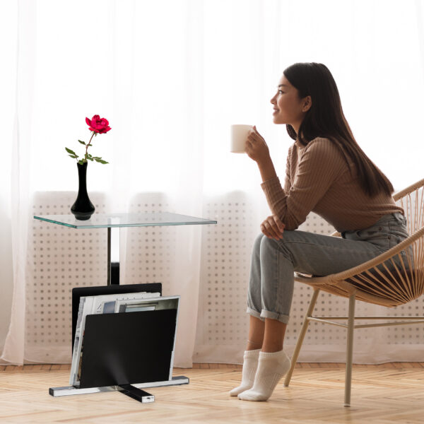 Pristatome šiuolaikišką ir stilingą šoninį staliuką su laikraščių lentyna, kuris puikiai derės prie bet kokio interjero. Šis staliukas ne tik suteiks jūsų erdvei elegancijos, bet ir padės išlaikyti tvarką, suteikdamas vietos jūsų mėgstamiems leidiniams.