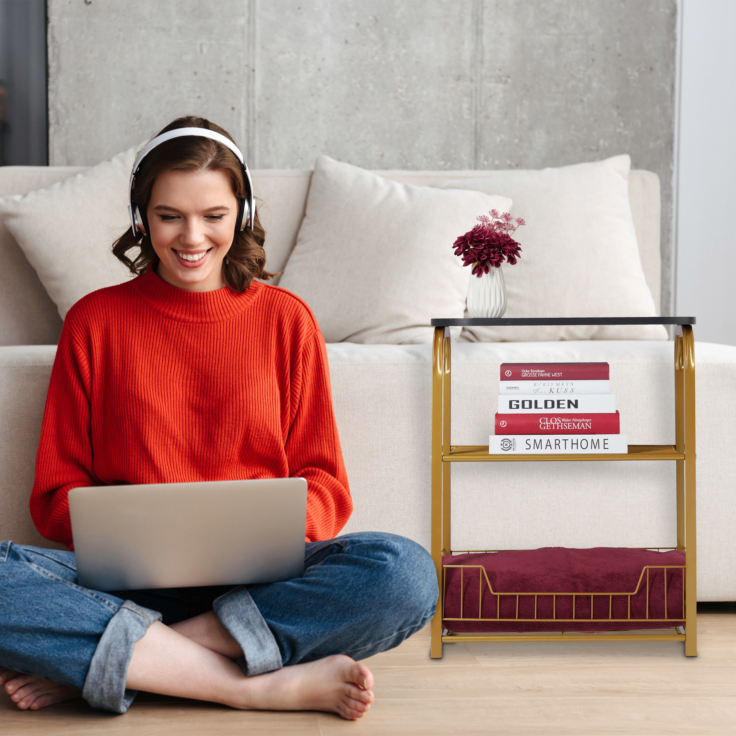 Praktiškumas: Idealiai tinka daiktams laikyti šalia sofos, suteikiant patogumą ir tvarką.