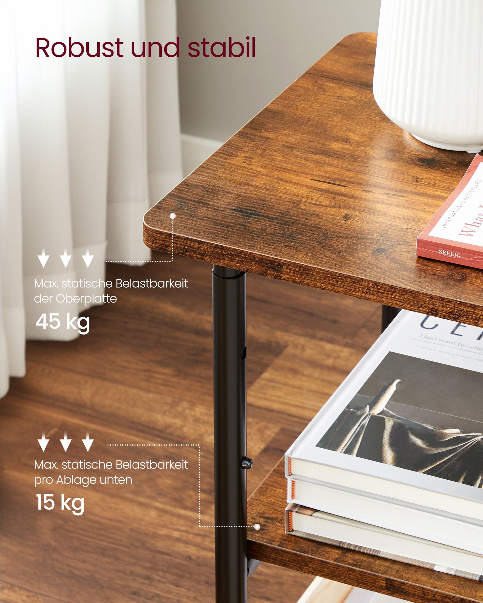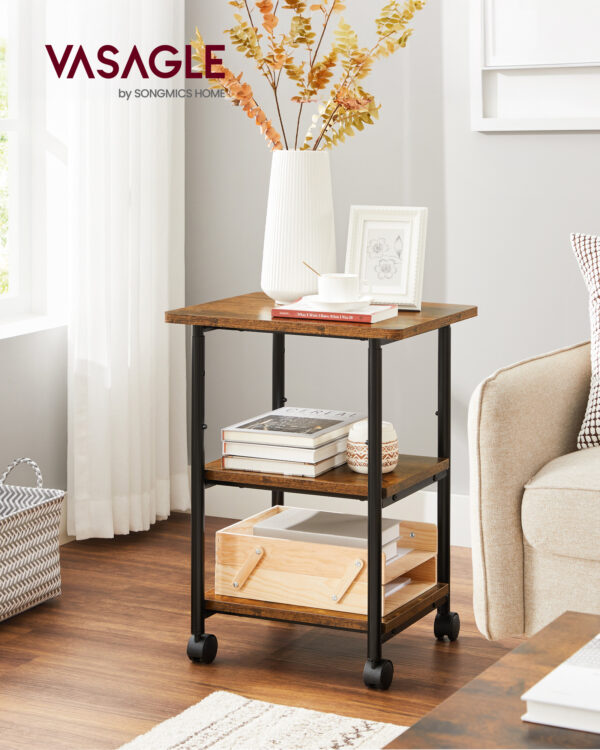 Šis šoninis staliukas yra ne tik estetiškai patrauklus, bet ir itin praktiškas. Jo ratukai leidžia lengvai perkelti staliuką į bet kurią vietą, o kelios lentynos suteikia pakankamai vietos daiktams laikyti. Tai puikus pasirinkimas tiek svetainėje, tiek miegamajame ar biure.