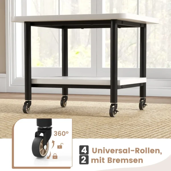 • 4 universalūs ratukai, iš kurių 2 su stabdžiais, leidžia lengvai perkelti ir užfiksuoti stalą.