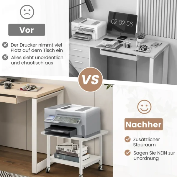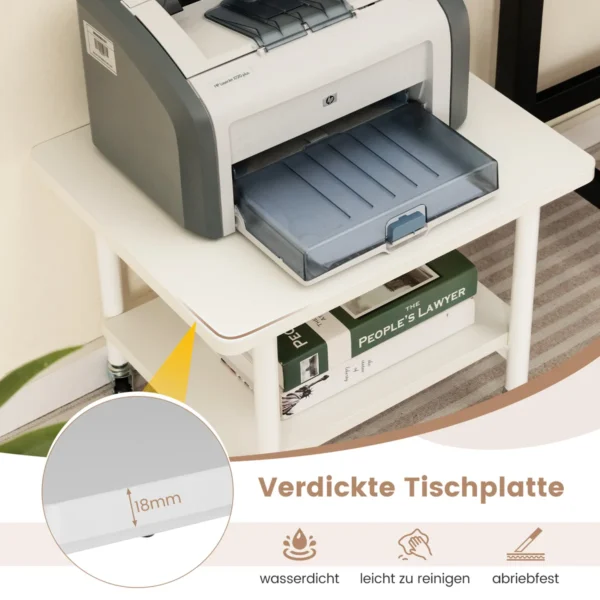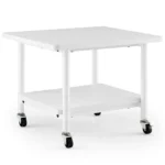 Spausdintuvo stalas 49x40x38 cm, baltos spalvos, yra praktiškas sprendimas patogiam spausdintuvo laikymui darbo vietoje. Dviejų pakopų konstrukcija suteikia papildomos vietos daiktams laikyti ir padeda palaikyti tvarką. Tvirtas metalinis rėmas bei atsparus stalviršis užtikrina ilgalaikį naudojimą ir stabilumą.