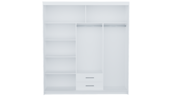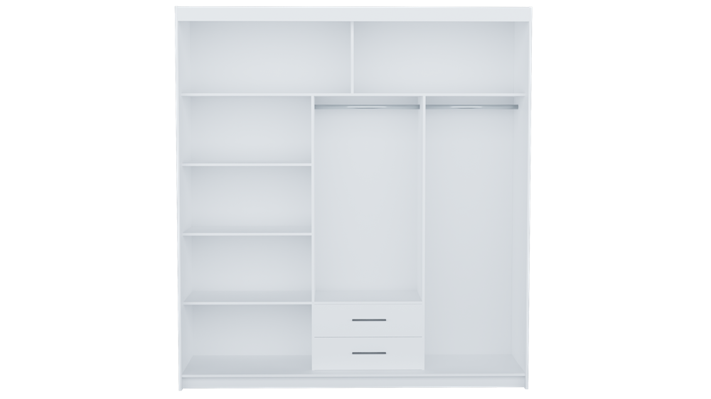 Viduje 6 lentynos, 2 drabužių kabyklos ir 2 stalčiai;