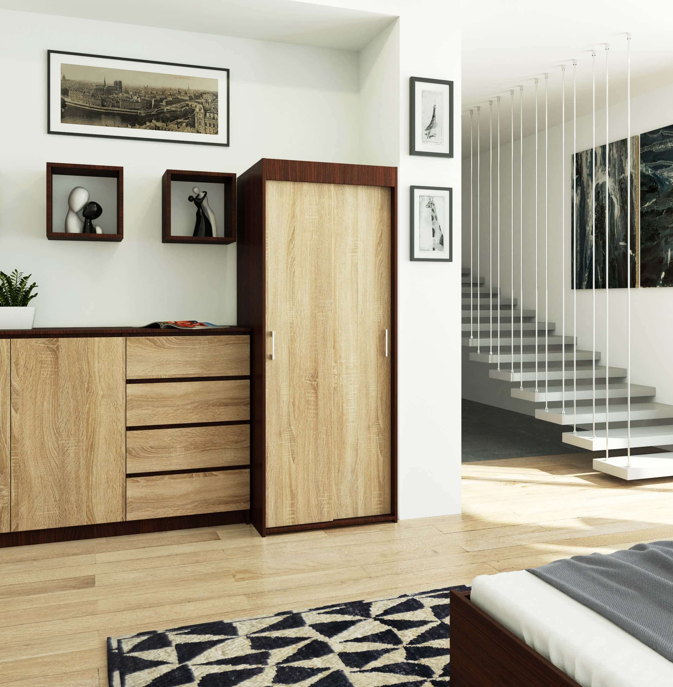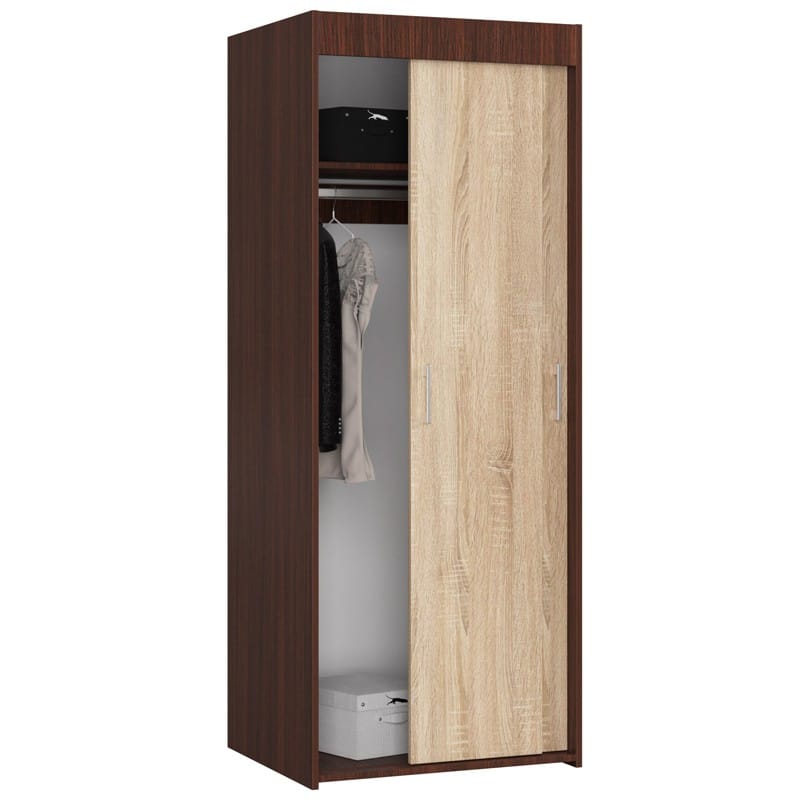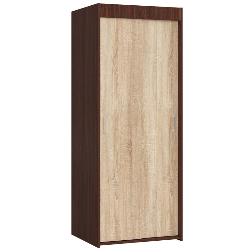 Prieškambario stumdoma spinta pagaminta tik iš trinčiai atsparios Kronospan laminuotos plokštės. Įdomus efektas buvo gautas dėl dviejų medienos raštų derinio. Baldo korpusas pagamintas iš tamsesnio laminato imituojančio, tamsiai rudos spalvos, o stumdomų durų sparnai – iš sonomos ąžuolo lentos. Spintelės kraštai padengti ABS plastiku. Tokia procedūra ilgai išlaiko baldus gražius., tamsiai ruda drabužių spinta / sonoma ąžuolas daugiausia skirtas pakabinamiems drabužiams laikyti. Virš juostos, einanti per visą spintos plotį sumontuota lentyna suteikia papildomos naudingos erdvės Baldas turi nemažai privalumų, o pristatomos spintos vartotojui svarbiausios savybės yra šios funkcijos: didelė talpa (180 cm aukščio, 70 cm pločio, 60 cm gylio); laisvas slydimas durys ant bėgių; daugybė dizaino galimybių dėl dviejų spalvų apdailos; universalus stilius; funkcionalumas – dėl stumdomų durų, prie baldų lengva patekti net siaurose erdvėse; kokybiškas darbas; dvejų metų gamintojo garantija. , tamsiai ruda / sonoma dviejų spalvų drabužių spinta su stumdomomis durimis puikiai tinka bet kokiam prieškambariui. Tinkamai parinktų matmenų dėka tilps daug viršutinių drabužių. Viršutinė, gili ir plati lentyna gali būti sėkmingai naudojama skrybėlėms, šalikams ar pirštinėms. Spinta puikiai atliks savo funkciją ne tik prieškambaryje ir koridoriuje, bet ir rūbinėje, miegamajame ar vaikų ar jaunimo kambaryje.