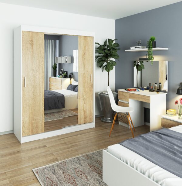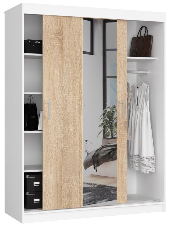150 cm CLP stumdoma spinta sonoma pavėsyje leis pasirūpinti reikiama erdve miegamajame ar persirengimo kambaryje, kurią galėsime panaudoti įvairiems daiktams susidėti ne tik rūbų pavidalu. , bet ir, pavyzdžiui, atsarginių lovatiesių. Tai, kaip valdome atitinkamus baldus, priklauso nuo mūsų individualių poreikių. Spintoje sumontuotas labai praktiškas ir naudingas veidrodžio formos elementas, kuris suteikia galimybę įsitikinti, ar pasirinktas stilius yra tinkamas. Taip pat galime sėkmingai patalpinti baldą prieškambaryje, svetainėje ar jaunimo kambaryje. Mūsų turimos vietos aptariamam gaminiui užtenka dviem žmonėms. Pristatomas stumdomos spintos modelis sujungia nesenstantį charakterį su dideliu funkcionalumu ir universalumu, todėl puikiai tiks mėgstantiems žmonėms naudingų ir praktinių sprendimų. Gaminys turi daug privalumų dėl to, kad jame, be kita ko, naudojama: patvari, tvirta ir aukštos kokybės laminuota plokštė li> daug lentynų ir drabužių kabyklos, suteikiančios puikias erdvės valdymo galimybes, aliuminio kreiptuvai, leidžiantys be problemų slysti, o tiksliau – naudoti durys. 150 cm stumdoma spinta yra vienas iš elementų, įtrauktų į CLP baldų sistemą, leidžiantis sukurti pilną komplektą, kuriuo galėsite įrengti daugiau nei vieną miegamąjį . Be to, estetine gaminio apdaila buvo pasirūpinta naudojant ABS apvadus, skirtus kraštams faneruoti.