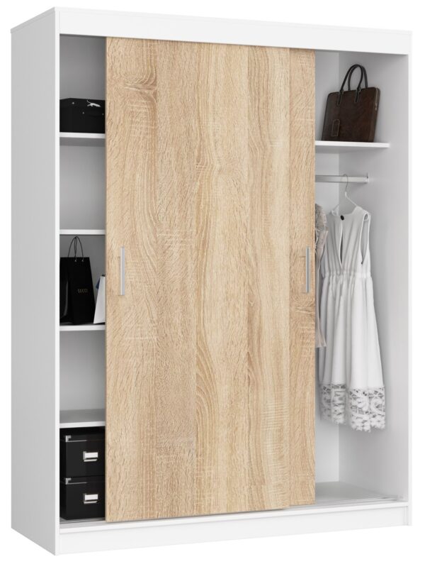 Didelė CLP MONO spinta pagaminta iš baldinės plokštės, padengtos dviejų spalvų laminatu. Baldo korpusas, baltas, o dvi stumdomos durys puikiai imituoja Sonomos ąžuolo spalvą ir grūdą. Spintelės apdaila yra matinė, o puikią baldo krašto būklę užtikrina pažeidžiamiausiose spintos vietose naudojama ABS fanera. Durų eigos sistema sudaryta iš aliuminio profilių, užtikrinančių patogų ir ilgalaikį naudojimą. CLP MONO interjeras vertikaliai padalintas į dvi dalis. Kairįjį stulpelį sudaro erdvios, plačios ir gilios lentynos, o viršuje dešinėje yra pertvara, kuri sukuria vieną lentyną, o po lentyna – drabužių kabykla. Didžiausi CLP MONO privalumai spintos yra: didelės talpos – baldas yra 200 cm aukščio, 250 cm pločio ir 60 cm gylio; didelė erdvė drabužiams pakabinti – iki 85 cm ; 6 erdvios lentynos; dviejų spalvų dizainas – balto ir sonomos ąžuolo derinys viename balde padidina galimybes išdėstymo; universalus stilius; vykdymas CLP baldų sistemoje – spinta gali būti derinama su kitų gamintojų baldais. CLP MONO spinta puikiai tinka naudoti rūbinėje, miegamajame, taip pat svetainėje, vaikų ar jaunimo kambaryje. Puikiai tiks kaip spinta namų prieškambaryje susidėti viršutinius drabužius, pirštines, kepures, šalikus ir pan. Šis baldas dera tiek su moderniu, tiek su skandinavišku stiliumi, ir su tinkamu kitų, taip pat tradicinių, baldų pasirinkimu.