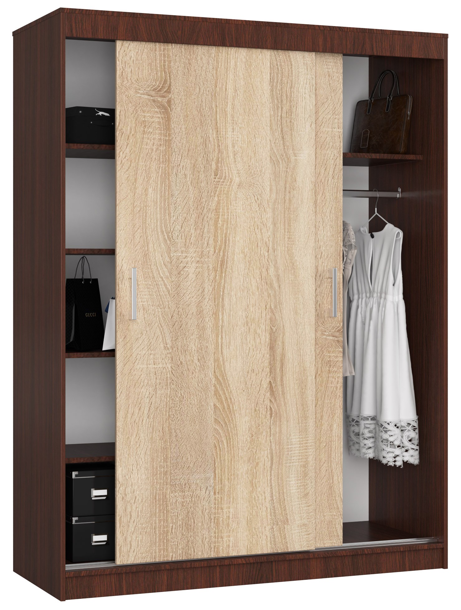Stumdomos spintos yra funkcionalūs baldai, kurie yra labai populiarūs. Jų taip pat galite rasti mūsų parduotuvės pasiūloje. Vienas iš pasiūlymų – dviejų spalvų 150 cm CLP spinta:, tamsiai ruda ir sonoma, kurios primena medieną. Baldai yra erdvūs ir patogūs naudoti. Puikiai tinka miegamajam, svetainei ar persirengimo kambariui. Ji skirta dviems žmonėms. 150 cm CLP spinta turi daug privalumų, kuriuos verta paminėti: ilgaamžiškumas – baldai pagaminti iš kokybiškos laminuotos plokštės, kuri yra atspari įbrėžimams ir pažeidimams, atsparumas – spintos kraštai padengti ABS apvadu, kuris suteikia didesnę apsaugą nuo pažeidimų, talpa – baldas, kurį sudaro drabužių kabykla ir stalčiai, o tai suteikia daug erdvės plėtrai, naudojimo patogumas – aliuminio profilių pagrindu veikianti sistema suteikia puikias kreipiamąsias savybes durys ir patogus naudojimas. funkcionalumas – baldas leidžia išlaikyti tvarkingus drabužius ir tekstilę, elegantiška išvaizda – spinta paprastos formos, o dviguba spalvos (wenge ir sonoma) suteikia stiliaus, patraukli kaina, garantija – 24 mėnesiai! Mūsų pasiūlymas, 150 cm CLP spinta, daugeliu atžvilgių yra labai geras pasirinkimas. Baldai tvirti ir funkcionalūs, taip pat gražiai atrodo. Jis tikrai tarnaus daugelį metų. Visa tai už prieinamą kainą! Spintelė skirta montuoti savarankiškai. Tačiau tai nėra problema – užsakymas pateikiamas su instrukcija, kuri palengvins baldų surinkimą.