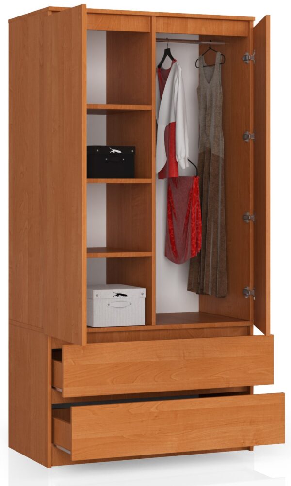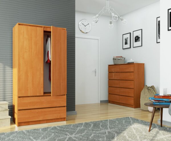 – Spinta iš laminuotos plokštės Kronospan, atsparios trinčiai – Stalčių fasadai iš laminuotos plokštės – Durelių viduje yra lentyna ir drabužiai bėgis – Stalčiai juda ant metalinių garsiosios GTV kompanijos ritinėlių kreiptuvų – Kraštai yra padengti ABS briauna, užtikrinančia aukštą apsaugą nuo pažeidimų – Savarankiškai surenkama spinta – Instrukcija pridedama – Gamintojo garantija 24 mėn.
