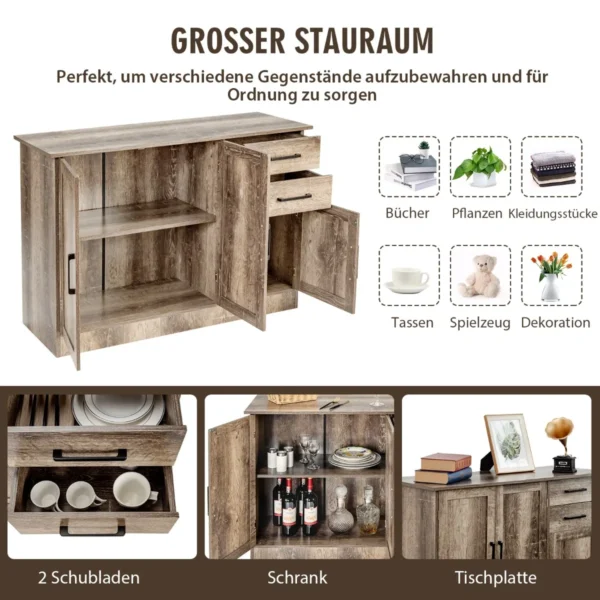 - Spintelėje yra platus stalviršis, trys durelės ir du stalčiai, suteikiantys daug vietos sandėliavimui.