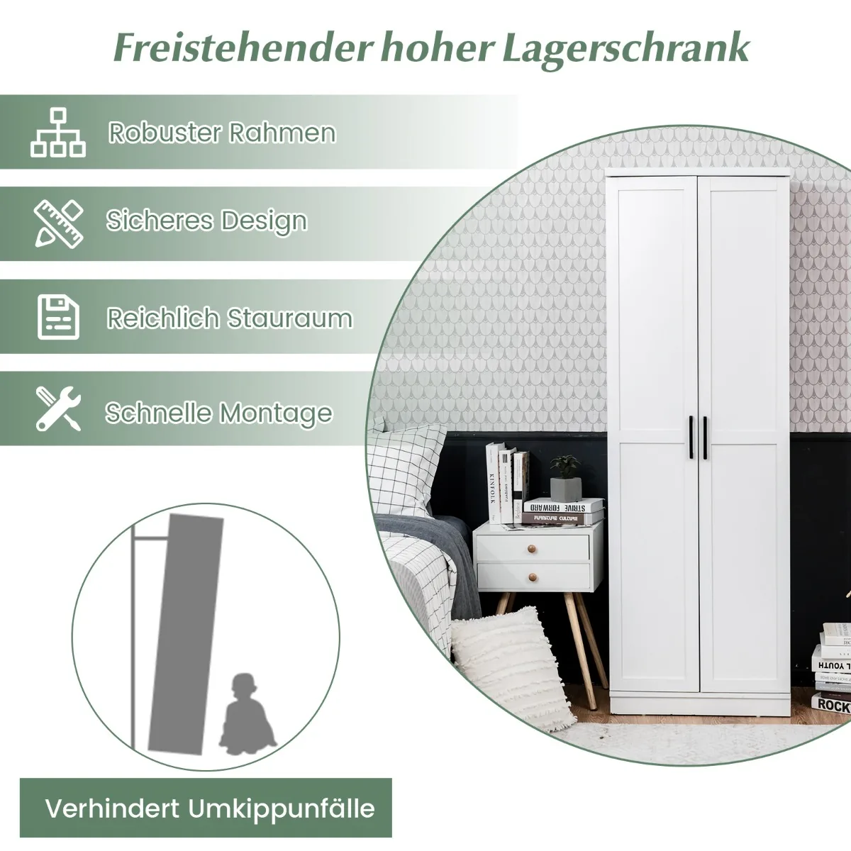 - Tvirtinimo prie sienos detalės, leidžiančios saugiai pritvirtinti spintelę ir apsaugoti nuo apvirtimo.