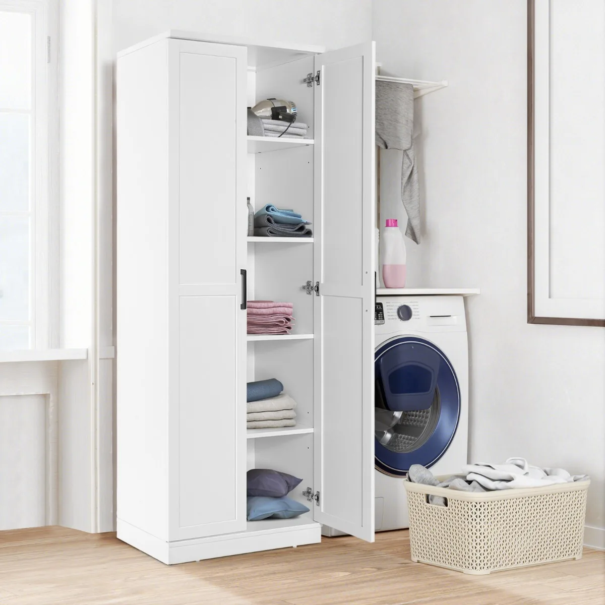- Laisvai pastatoma dviejų durų spintelė su penkių pakopų saugojimo vietomis.