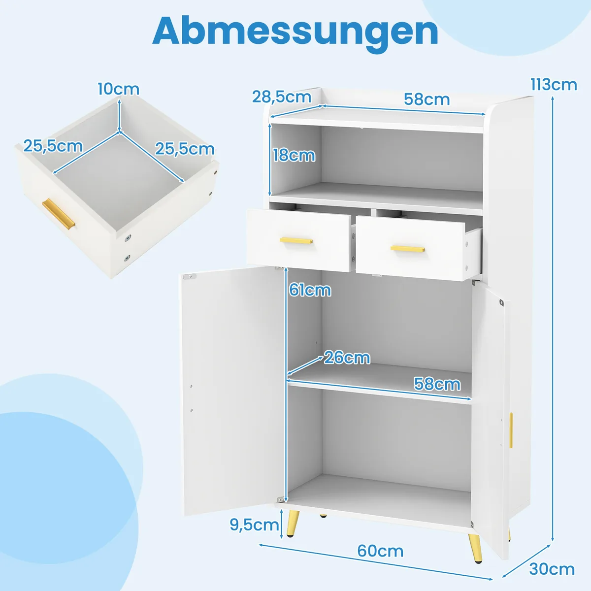 Spintelė 60x30x113cm baltos ir auksinės spalvos yra universali laikymo sistema, skirta įvairių daiktų tvarkingam sudėjimui. Dėl reguliuojamos lentynos ir įvairių skyrių ji tinka tiek virtuvės indams, tiek valgomojo ar kitoms patalpoms. Spintelė užtikrina erdvumą ir funkcionalumą jūsų namams.