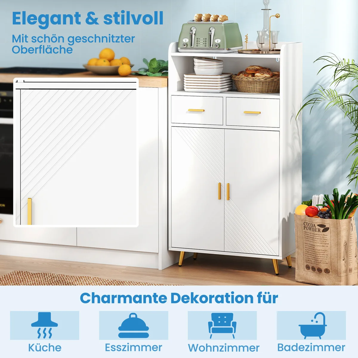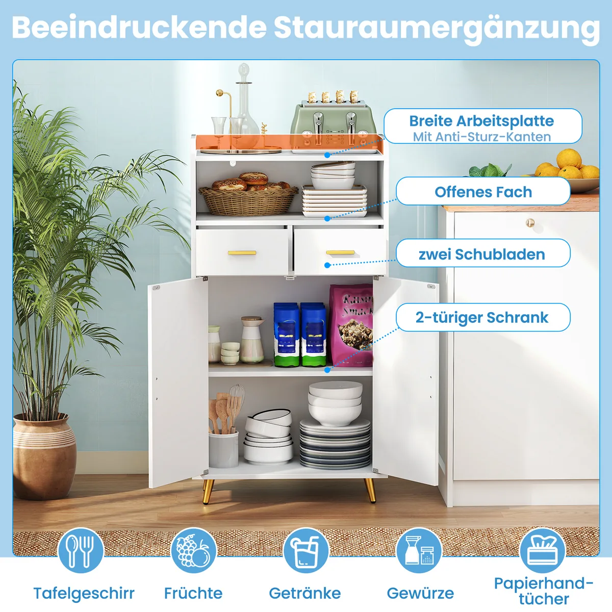 • Atviras skyrius, du stalčiai ir dviejų durų spintelė optimaliam daiktų organizavimui.