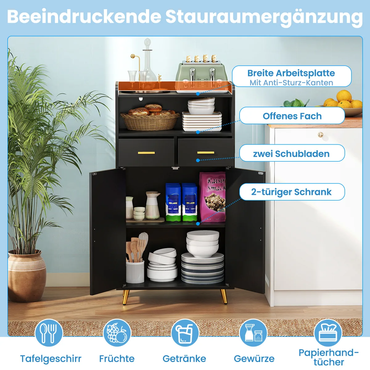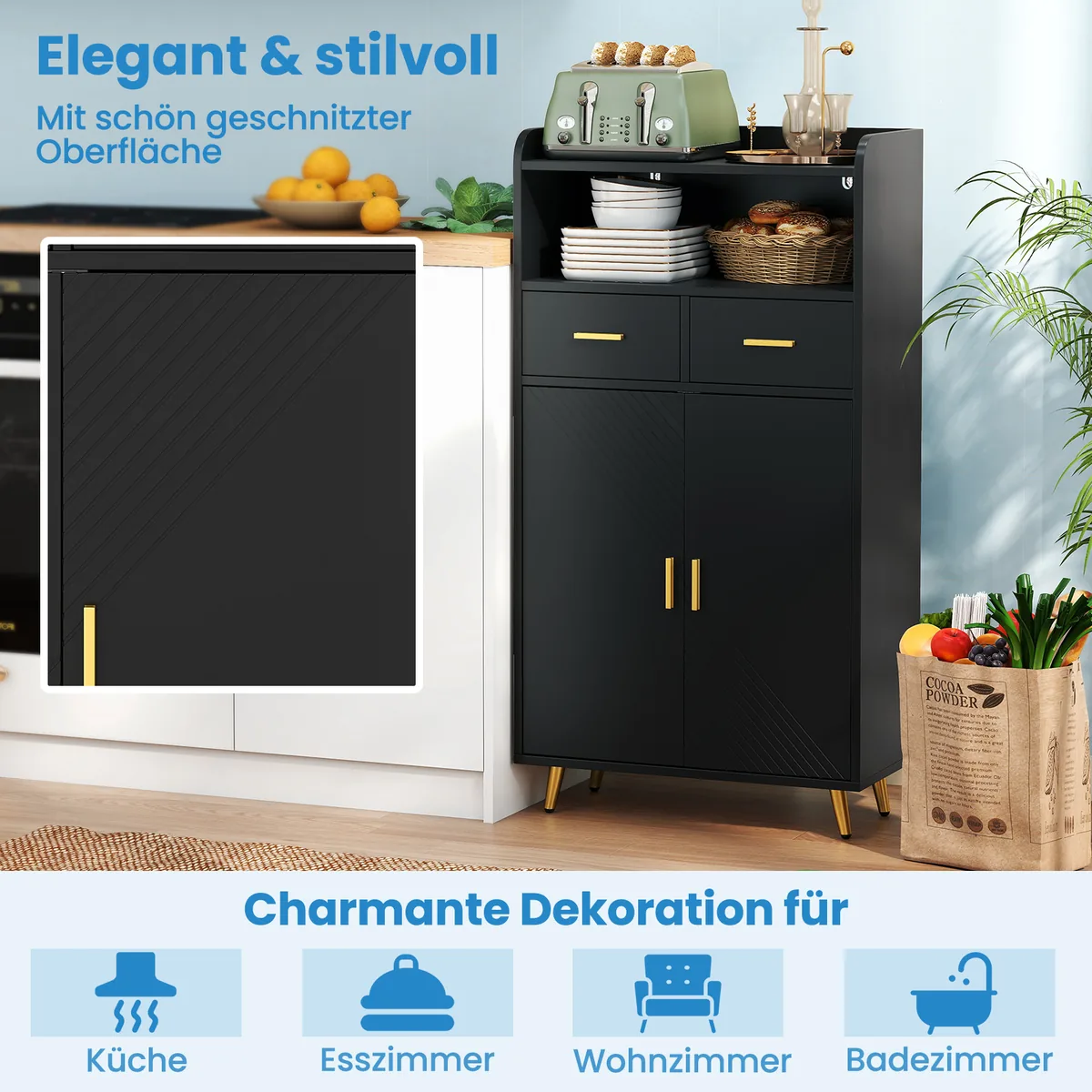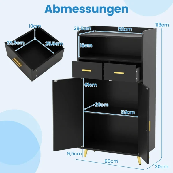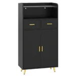 Spintelė 60x30x113cm juodos ir aukso spalvos puikiai tinka įvairiems laikymo poreikiams. Šis universalus baldų elementas suteikia patogią vietą indams, virtuvės reikmenims ar kitiems daiktams organizuoti ir laikyti.