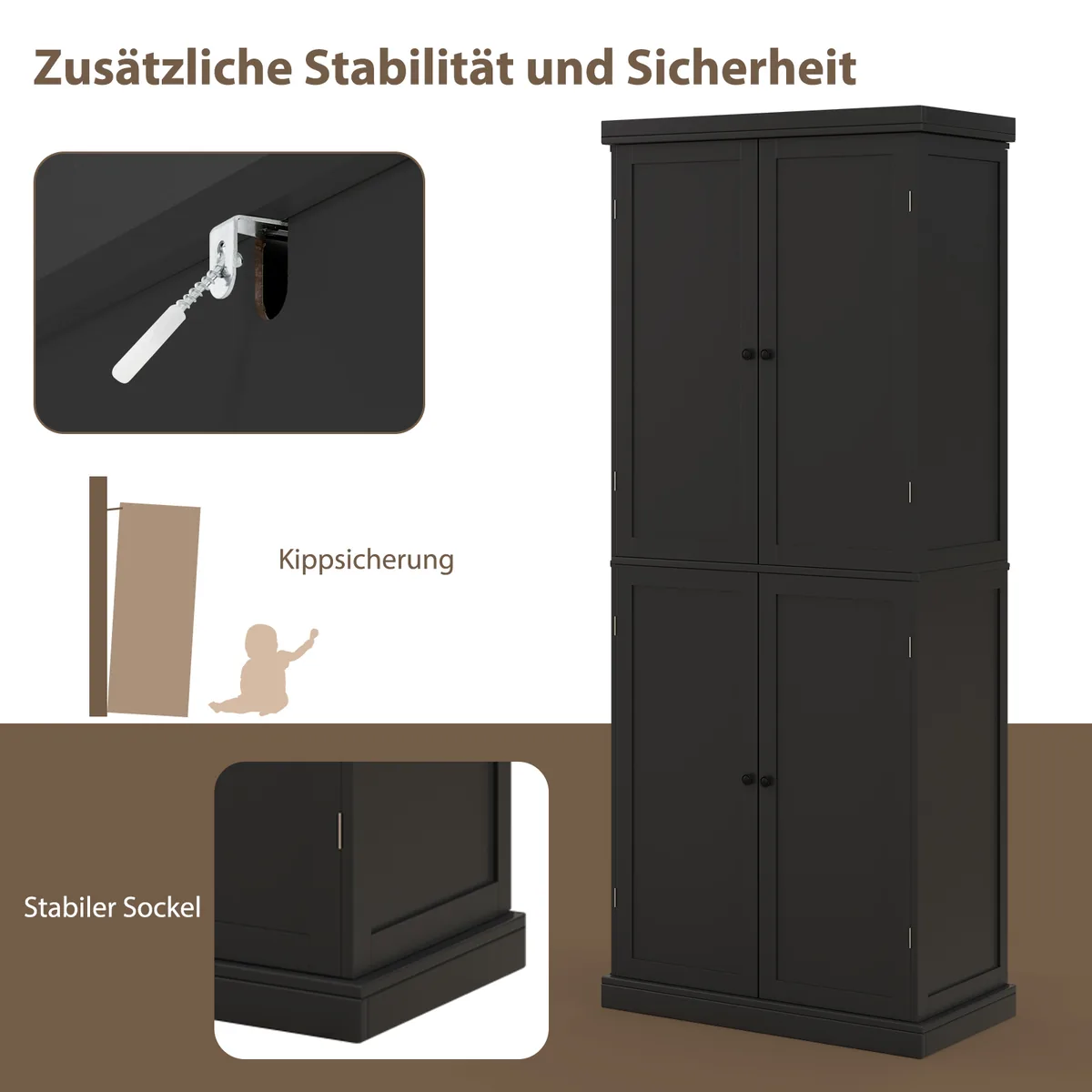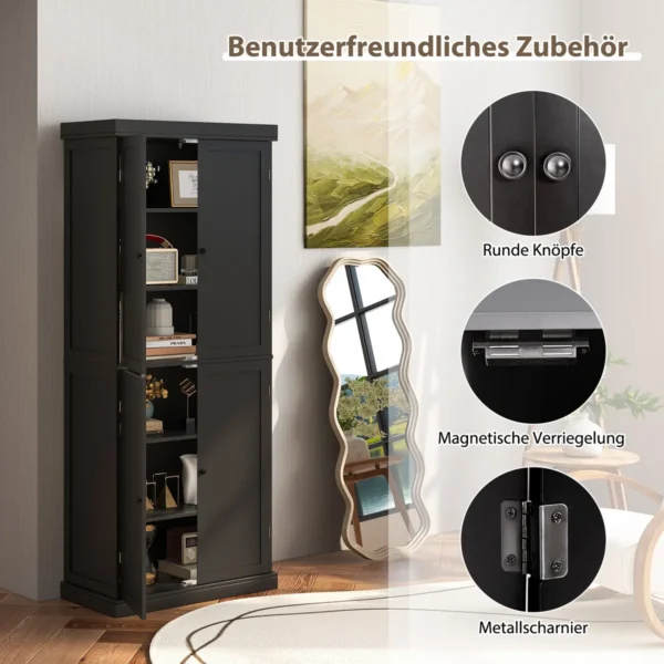 - Sandėliuko spintelė su 4 durimis ir 6 pakopų lentynomis suteikia daug vietos įvairių virtuvės reikmenų laikymui.