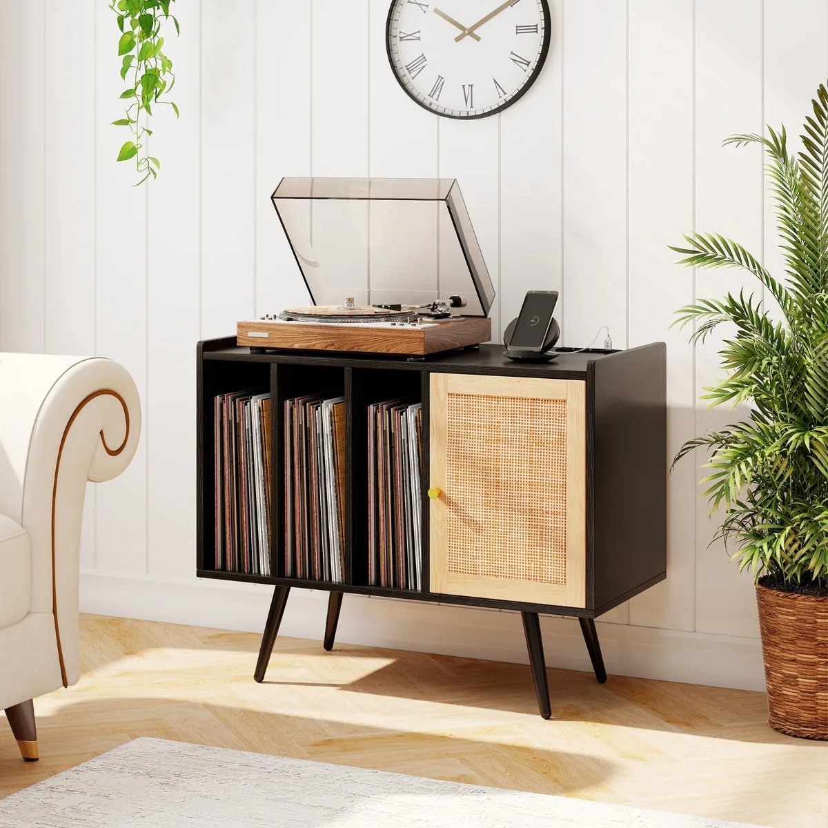 Spintelė 80x40x65cm., juodos ir šviesiai rudos spalvos, skirta patefonui ir vinilinių plokštelių saugojimui. Tai funkcionali ir praktiška spintelė su maitinimo stotele, rotango durimis bei reguliuojama lentyna, padedanti tvarkingai laikyti garso įrangą ir albumus.