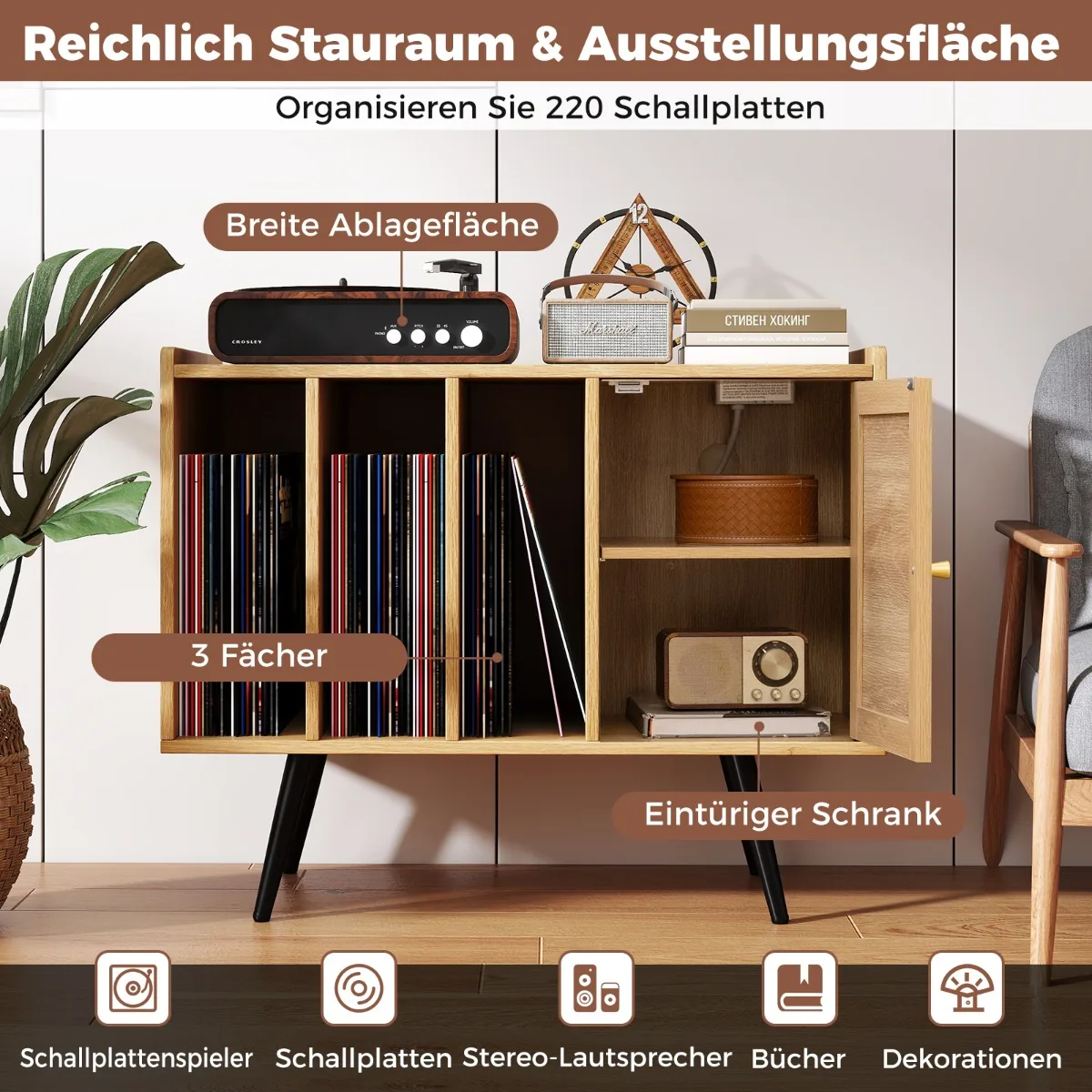 Spintelė 80x40x65cm, šviesiai rudos ir juodos spalvos, skirta vinilinių plokštelių saugojimui ir patefono stovui. Ši medinė spintelė su rotango durimis ir integruota įkrovimo stotele patogiai talpina įrašus bei leidžia vienu metu įkrauti kelis įrenginius. Kabelių valdymo anga mažina netvarką ir užtikrina tvarkingą aplinką.