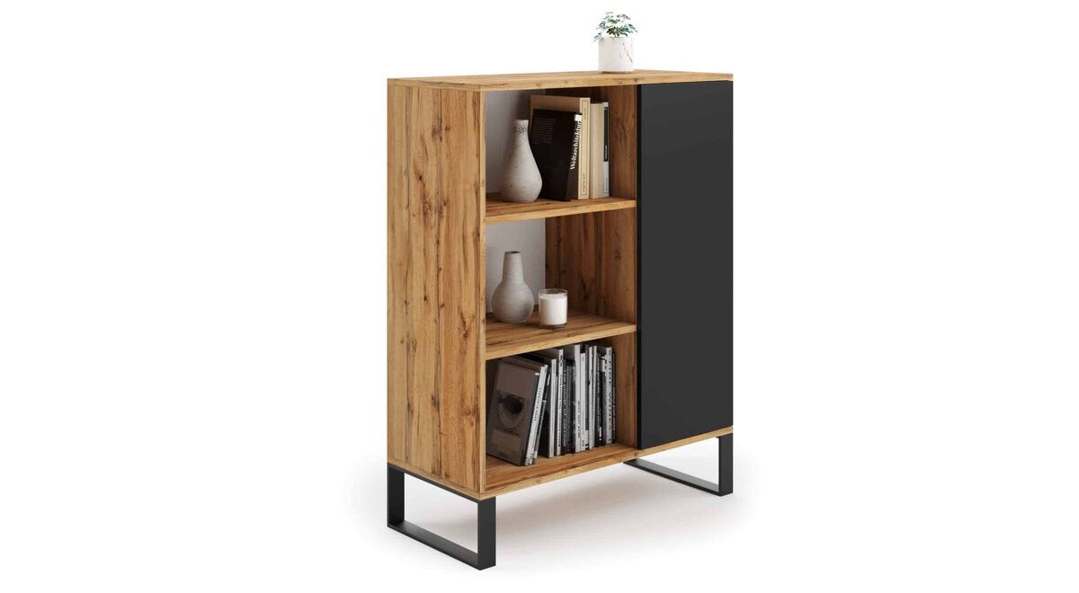 Spintelė Fondi 116,4x90x40 cm, natūralios medžio ir juodos spalvos, yra puikus pasirinkimas jūsų namų interjerui. Priekis ir korpusas pagaminti iš 18 mm storio laminuotos baldinės plokštės, kuri yra padengta iš abiejų pusių. Visi kraštai kruopščiai padengti ABS apvadu, užtikrinant ilgaamžiškumą ir estetinį vaizdą.