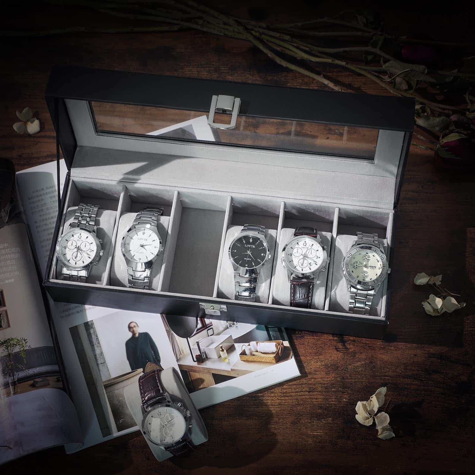Ar visada pamirštate, kur padėjote laikrodį? Šioje klasikinėje ir elegantiškoje laikrodžių dėžutėje su stikliniu viršumi telpa 6 laikrodžiai, kurie anksčiau rinko dulkes ant jūsų naktinio staliuko arba sėdėjo komodoje.