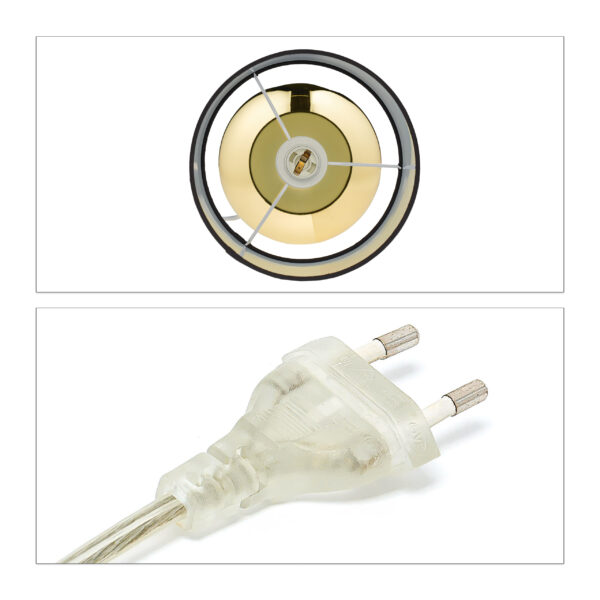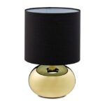 - Modernus dizainas: Šviestuvas pasižymi apvaliu geležiniu pagrindu ir dideliu audinio atspalviu, kuris puikiai dera su juodos ir auksinės spalvų deriniu.