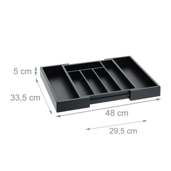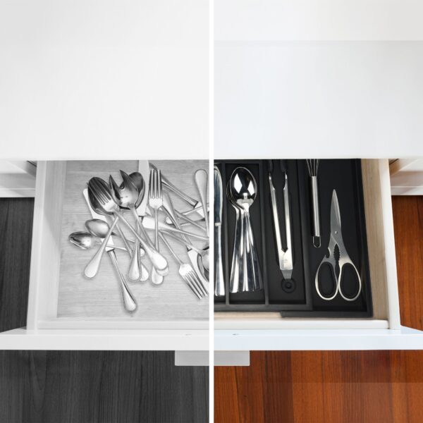 - Universalumas: Padėklas turi 5 pagrindinius ir 2 ištraukiamus skyrelius, suteikiančius daug vietos ne tik stalo įrankiams, bet ir didesniems virtuviniams peiliams bei įvairiems maisto ruošimo įrankiams.