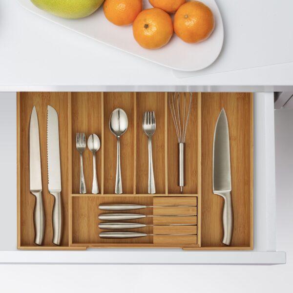 - Funkcionalus dizainas: 4 pailginti skyriai, skyrius su peilių bloku ir 2 ištraukiami šoniniai skyriai suteikia pakankamai vietos visiems stalo įrankiams ir kitiems virtuvės reikmenims.