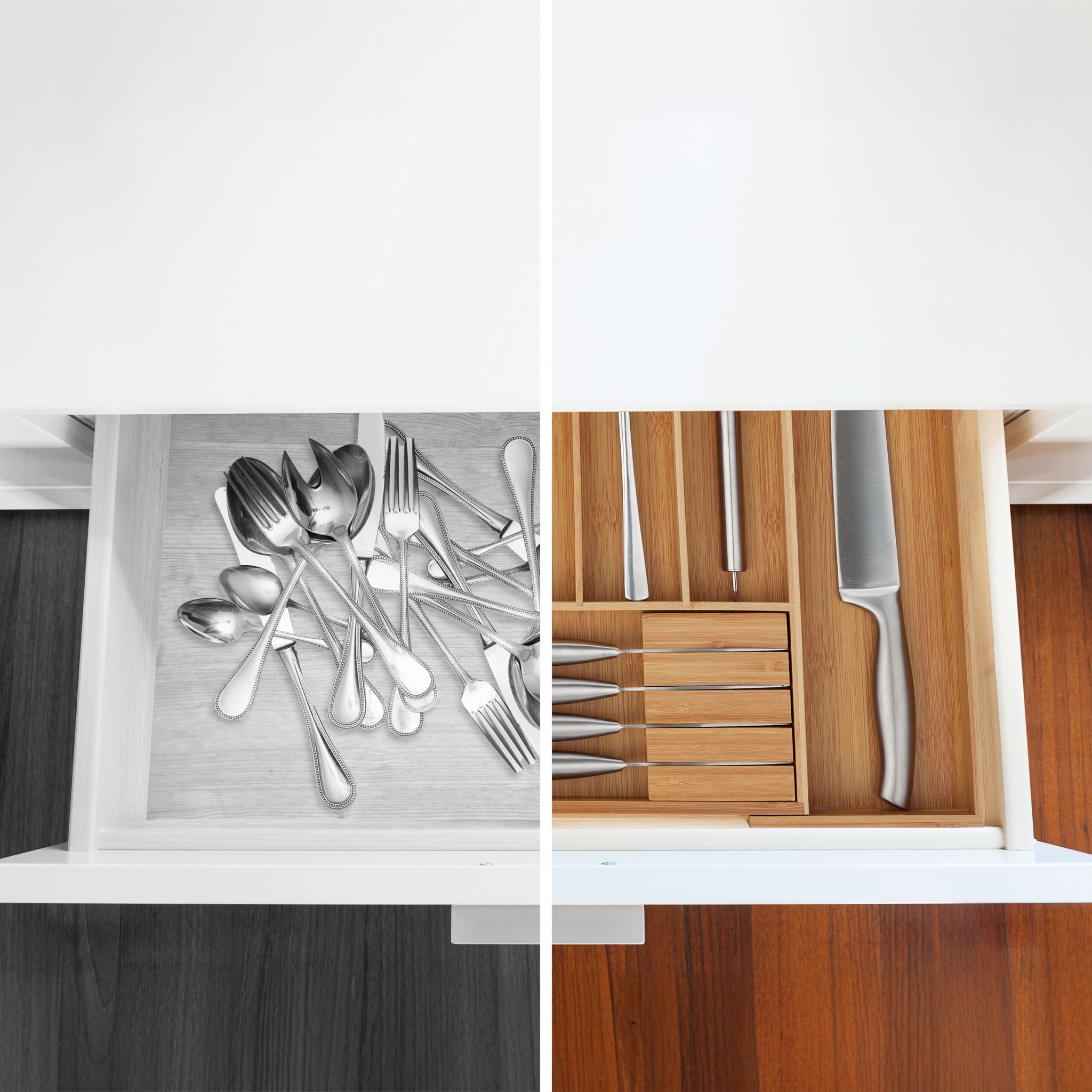 - Universalumas: Šoninių skyrių plotis yra įvairus, todėl padėklas tinka įvairių dydžių stalčiams.