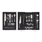 - Universalus dizainas: Padėklas turi 7 pagrindinius ir 2 ištraukiamus skyrelius, suteikiančius daug vietos įvairiems stalo įrankiams, didesniems virtuviniams peiliams ir kitiems maisto ruošimo įrankiams.