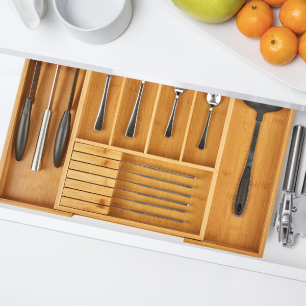 - Daugiafunkcinis Naudojimas: Keli skyriai suteikia pakankamai vietos stalo įrankiams, mediniams šaukštams, kitiems indams ir virtuviniams peiliams.