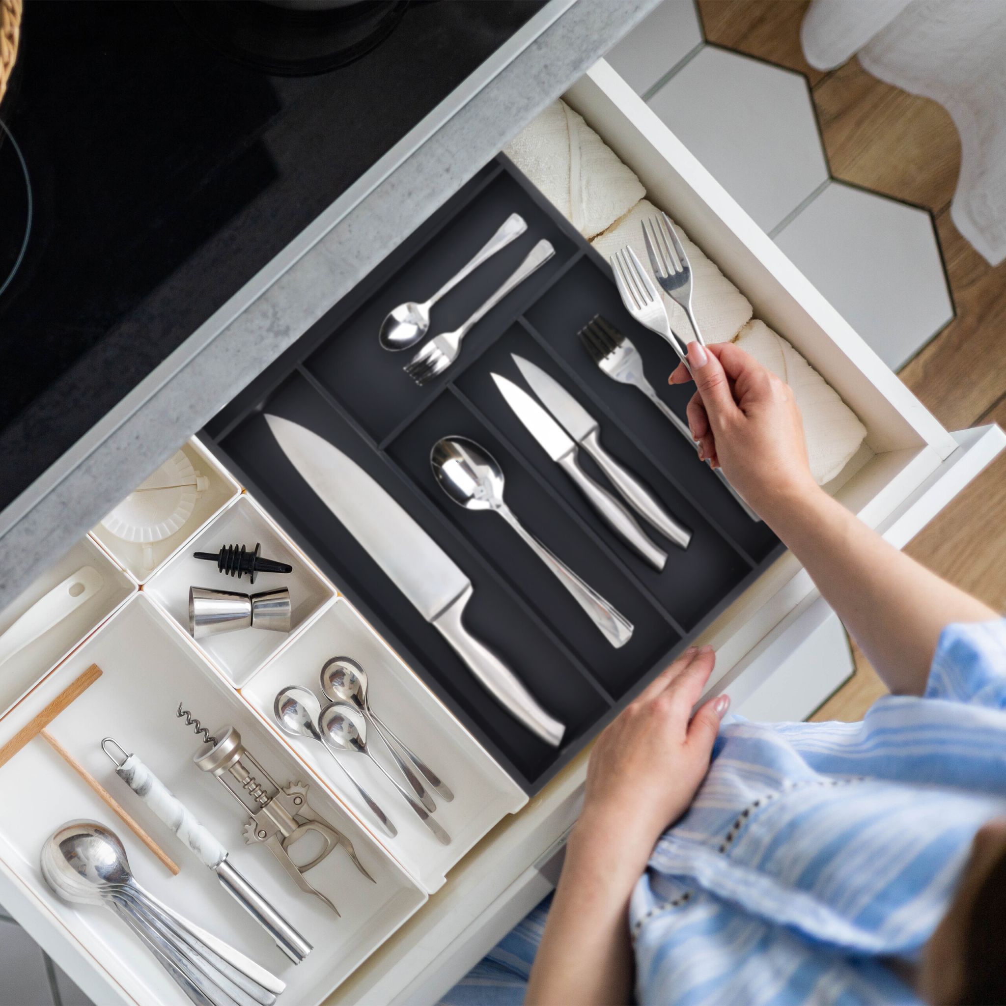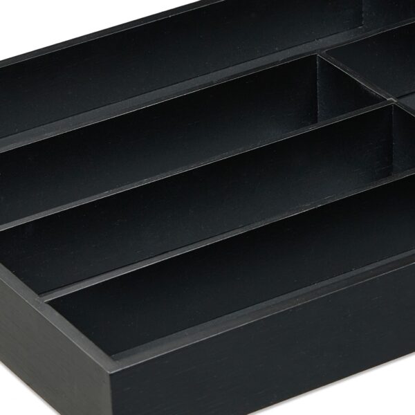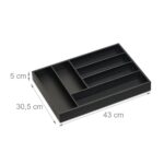 Įneškite tvarkos ir elegancijos į savo virtuvę su šiuo universaliu bambukiniu stalo įrankių dėklu. Pamirškite apie painius stalčius – šis juodas stalčių tvarkytuvas su 6 erdviais skyreliais suteikia daug vietos ne tik stalo įrankiams, bet ir didesniems virtuviniams peiliams bei įvairiems maisto ruošimo įrankiams.
